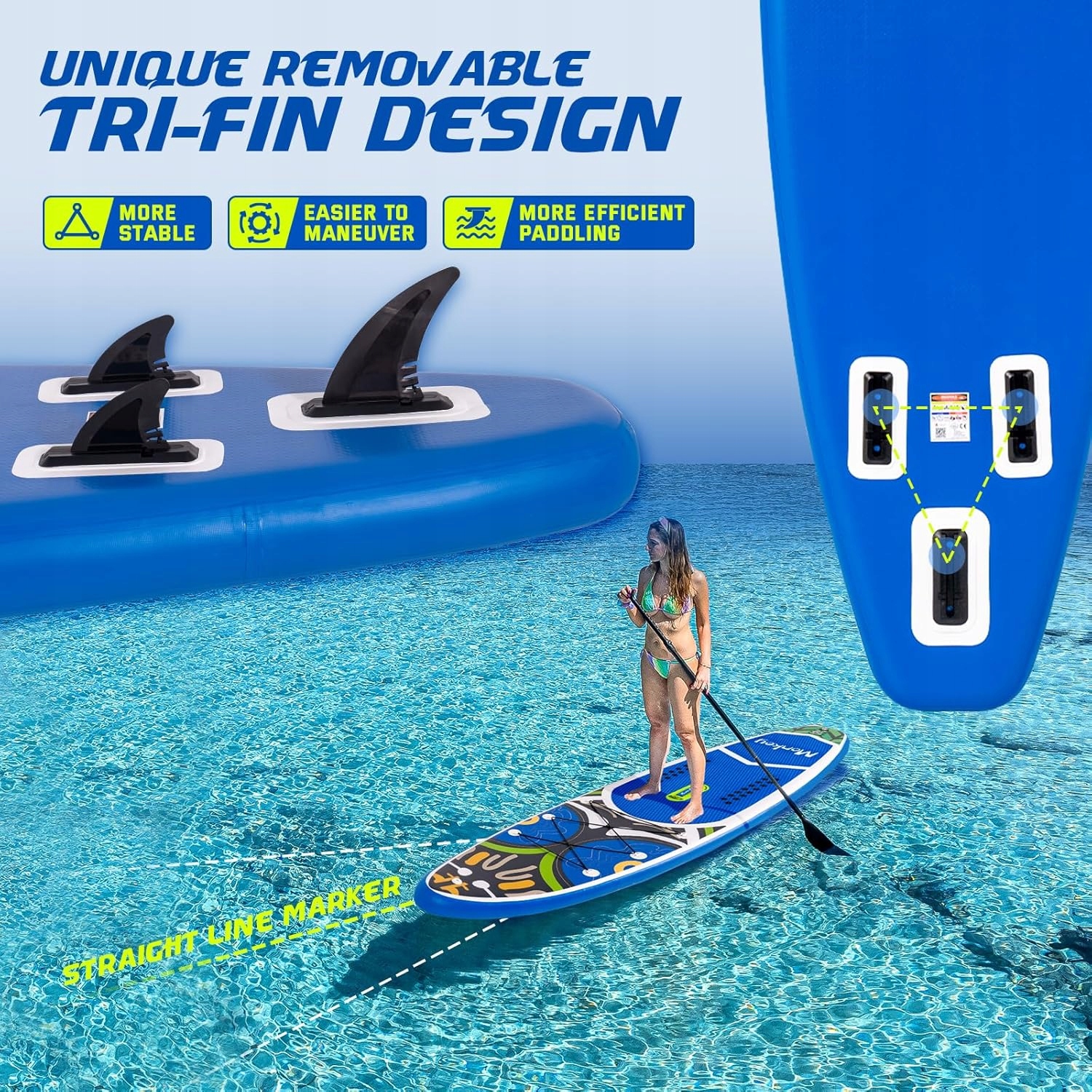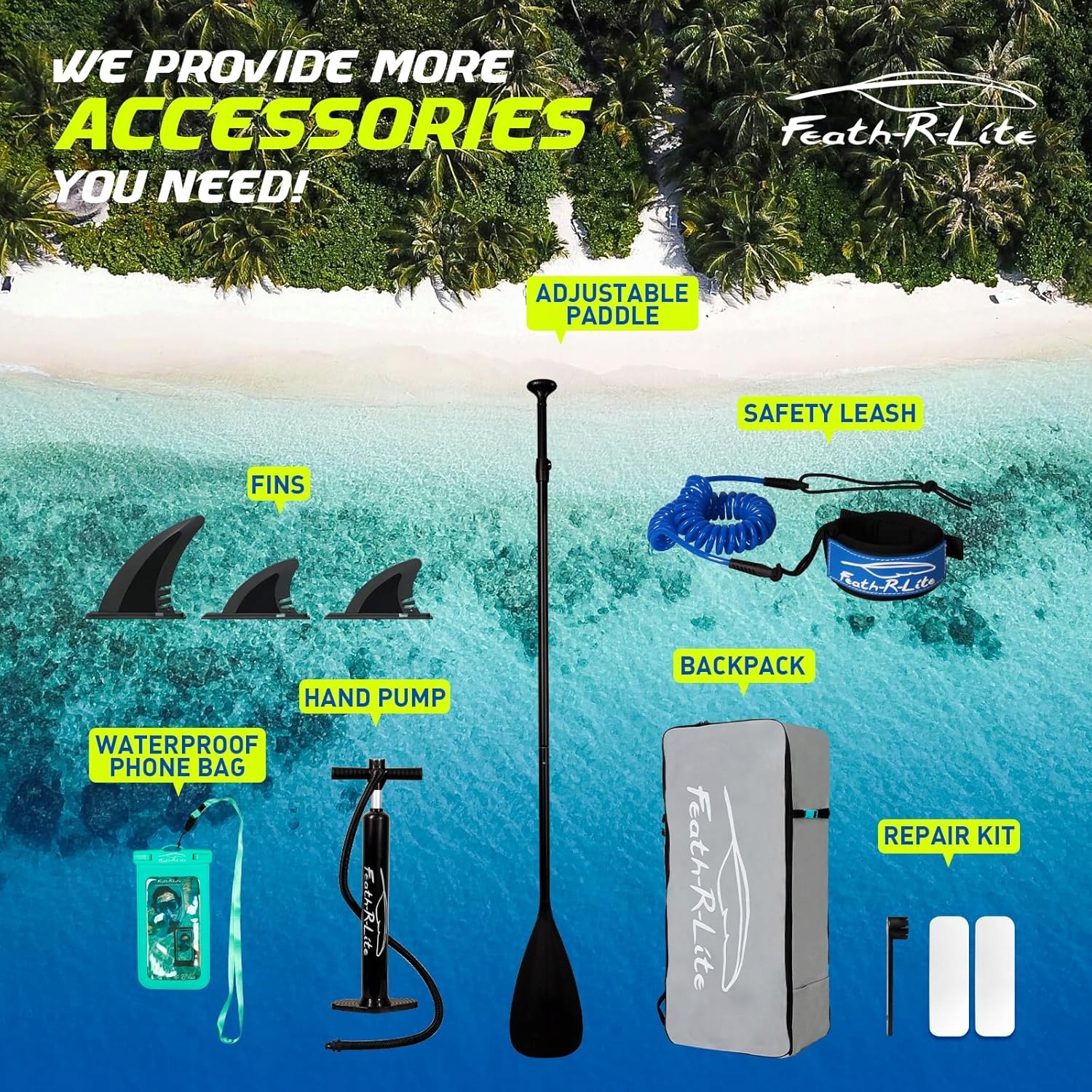 - Універсальна дошка: Ця дошка для веслування стоячи підходить для плавання, йоги, походів, риболовлі та водного серфінгу. Завдяки оновленим D-кільцям, безпечному повідку, простору для багажу та аксесуарам преміум-класу наш надувний SUP працює за будь-яких умов.