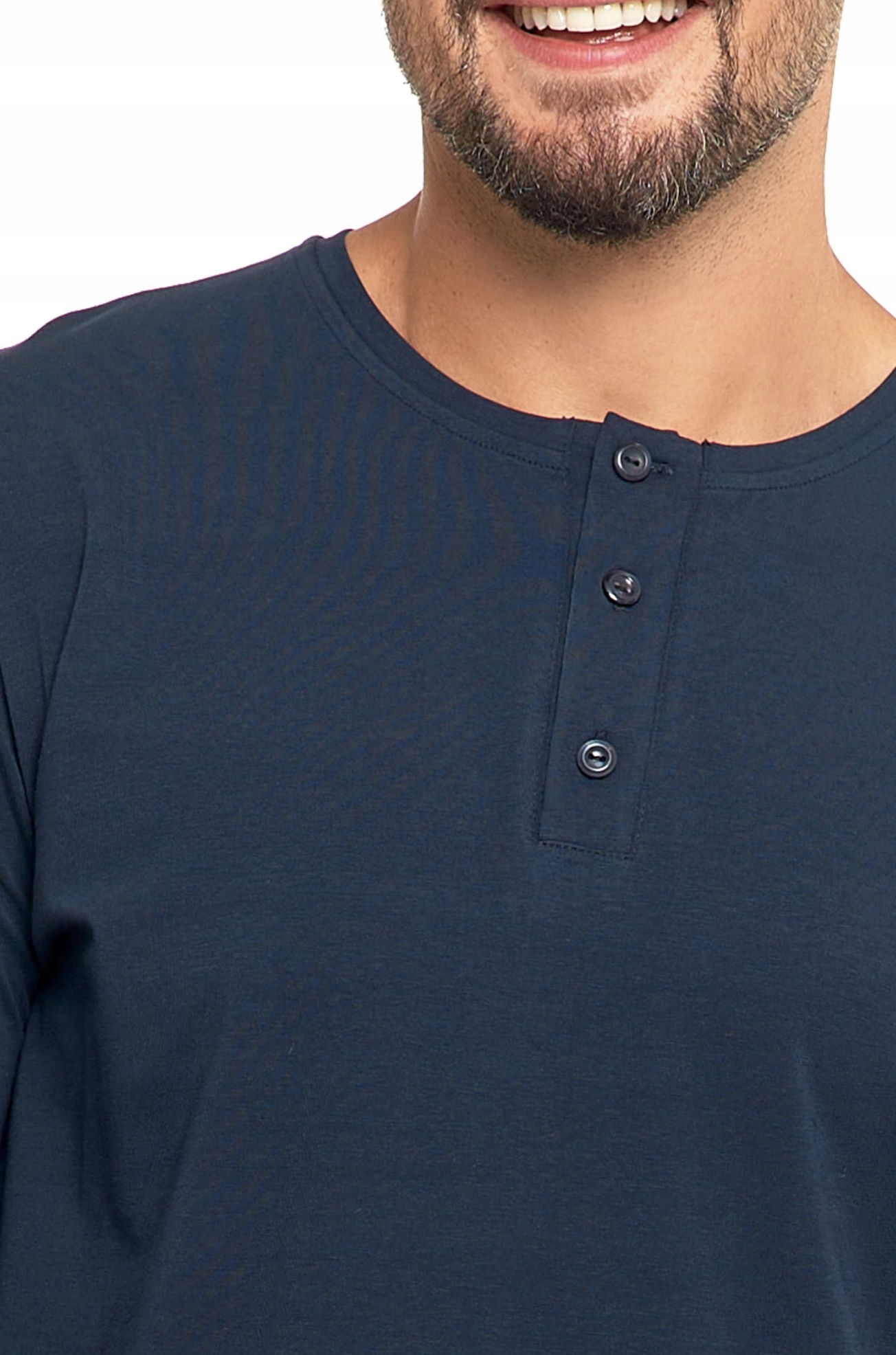 Стильні чоловічі піжами, що складаються з двох частин: гладкий, темно -синій довгий -т -сорочка та штани з класичним пледним малюнком.