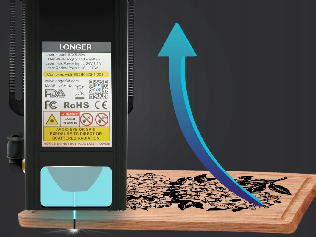 Лазерний гравір Longer Ray5 20 000 мВт оснащений твердотільним лазерним модулем потужністю 20 000 мВт, здатним за один прохід різати соснову деревину 0,59"/15 мм, нержавіючу сталь 0,002"/0,05 мм і акрил 0,31"/8 мм. Можна навіть робити кілька проходів, щоб прорізати деревину товщиною 25 мм і акрил товщиною 35 мм.