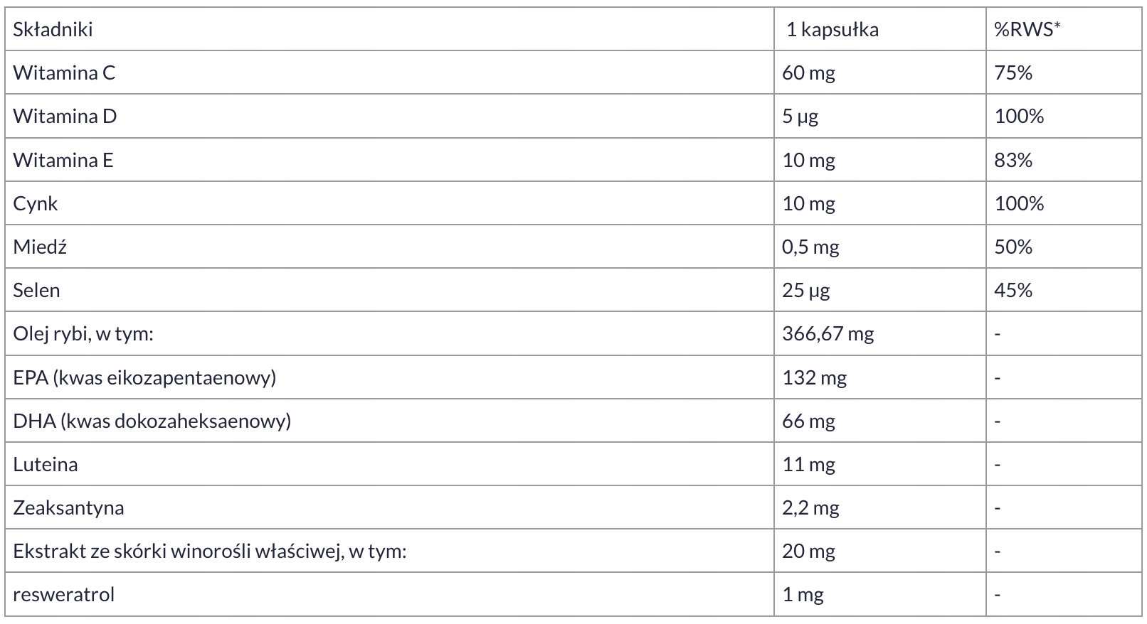 Склад : капсула (яловича желатин, гелева речовина: гліцерин, барвник: оксиди та гідрокси), риб'ячий жир, стандартизований на 40% ейкозапентенічної кислоти (EPA), 20% докозоенічної кислоти (DHA); Повністю вдосконалена соєва олія, вітамін С (кислота-аскорбічна), лютеїн, зеаксантин, емульгатор: бджолиний віск, білий і жовтий; Сульфат цинку (цинк), екстракт шкіри належної лози (Vitis Vinifera L.) DER 30: 1 Стандартизований до 5% ресвератролу, вітаміну Е (D-альфа-токоферолу), селену (дріжджі, збагачених у селену), соєвий лецитін, мідь (мідь сульфату (II), Vitamin (CholeciCifierol).