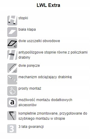 LWL Extra - дерев'яні горищні сходи нової конструкції з покращеними теплоізоляційними параметрами. Для підвищення безпеки та комфорту використання сходи оснащені додатковим поручнем, встановленим на середній сегмент, і механізмом розвантаження, який допомагає складати та розкладати драбину.