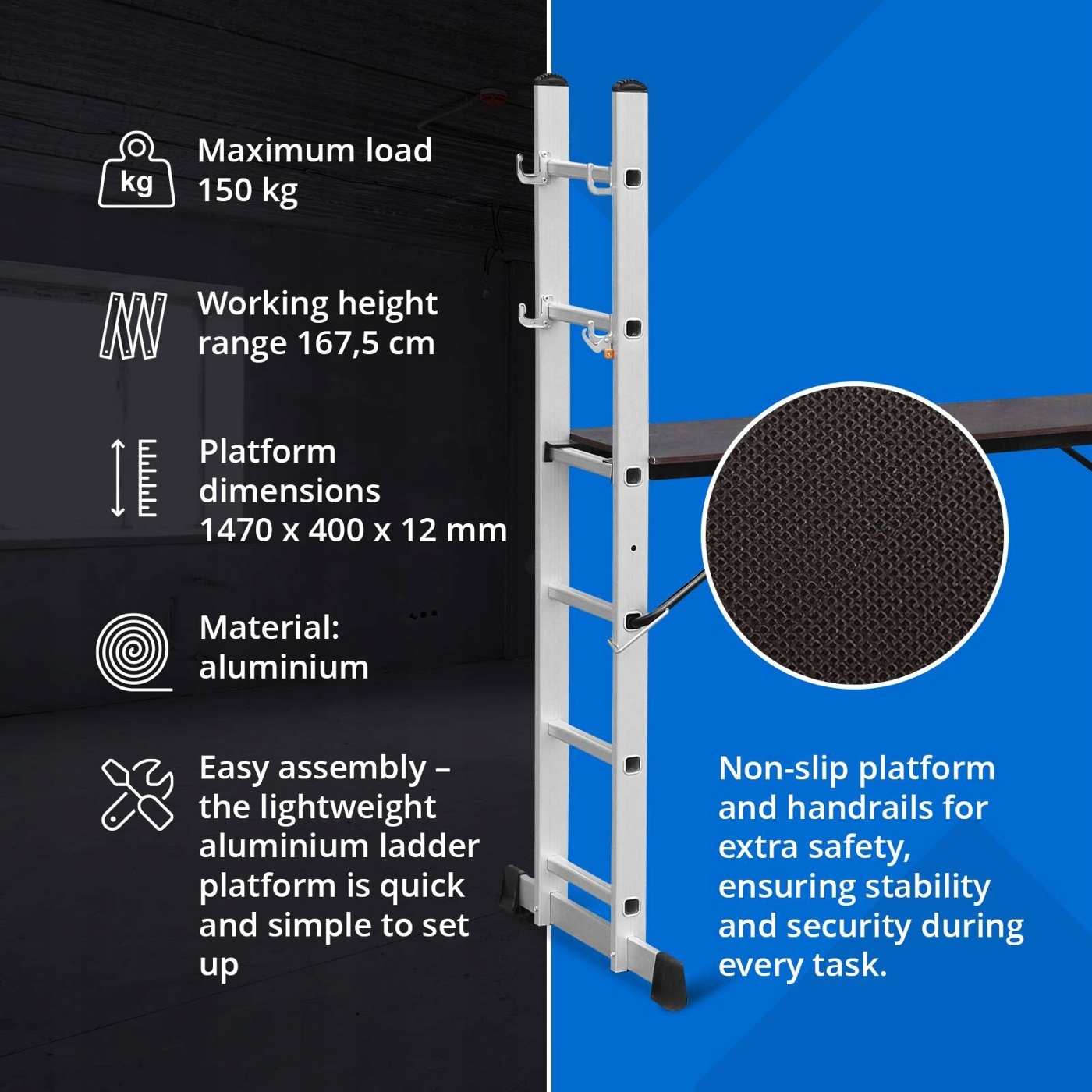 Продукт: 2 Універсальність - алюмінієві ліси будуть використовуватися 3 способами: як драбина з висотою до 2,73 м, безкоштовна сходи та робота з роботою - складання лісів з платформою 1,47 х 0,4 м, яку ви встановите на висоту 1,67 м