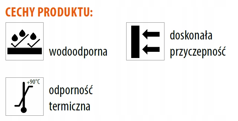 Продукт характеризується високою адгезією до основи та гнучкістю, а також високою стійкістю до води, бензину, жиру та олії.