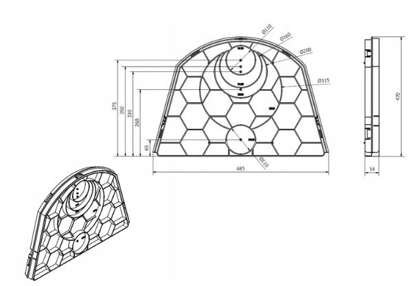 - Вхідні з'єднання в кришці діаметром Ø 110, Ø160, Ø200, Ø315 мм