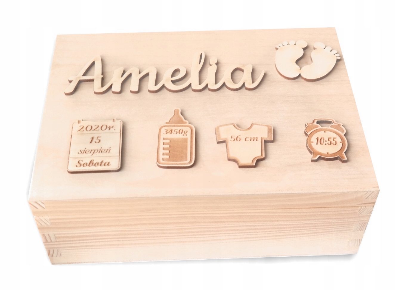 Індивідуальна дерев'яна скринька, ідеальна як подарунок народження дитини чи день народження , Святе Хрещення, день народження тощо. Можна використовувати для зберігання фотографій та інших сувенірів на згадку про особливі моменти дитинства.