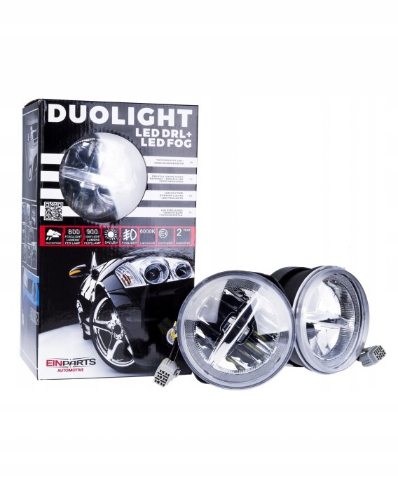 Модель EinParts DUOLIGHT оснащена тримачами, адаптованими до оригінальних кріплень протитуманних фар у популярних автомобілях (понад 100 моделей автомобілів!). Це заміна протитуманних фар, тому просто зніміть оригінальні галогенні лампи та замініть їх на лампи DUOLIGHT - жодних модифікацій, все підходить ідеально. Duolight - унікальна лампа з двома функціями - денне світло і протитуманне світло в одному! Для отримання денного світла використовувалася новітня технологія Light Line, завдяки якій світло рівномірне і не видно жодної точки світла. Для підсвічування оптоволокна були встановлені найкращі діоди на ринку - американського виробника CREE. У свою чергу для виготовлення протитуманки використовувався 1 потужний діод CREE потужністю до 10 ВАТ! Завдяки цьому рішенню протитуманна фара відповідає всім стандартам, необхідним для отримання схвалення. Денні ходові вогні дозволять іншим учасникам дорожнього руху швидше та краще розпізнати автомобіль. Дослідження показують, що такий тип освітлення знижує кількість аварій із серйозними травмами на 58%. Термін служби діодів у лампах до 50 000 годин.