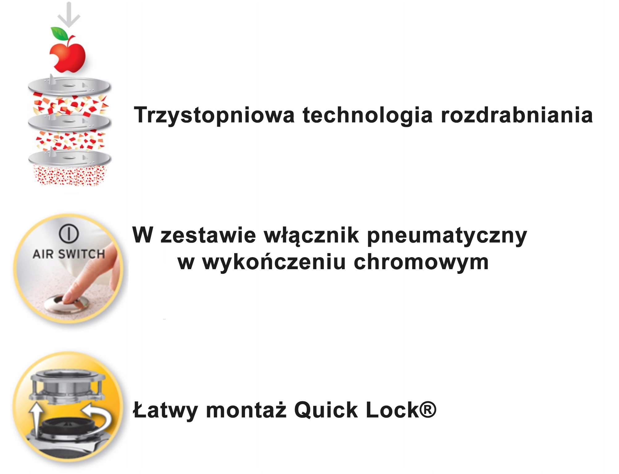 Зроблено в США. Призначений для великих активних сімей. Є ПНЕВМАТИЧНИЙ ПЕРЕМИКАЧ. Кухонний подрібнювач покращує гігієну кухні, усуваючи неприємні запахи, пов'язані з розкладанням залишків їжі, а також зменшує кількість вивезених відходів до 40%, таким чином зменшуючи потребу в миючих засобах, які використовуються на кухні. Подрібнювач відходів є екологічно чистим, простим у встановленні та дешевим у експлуатації.