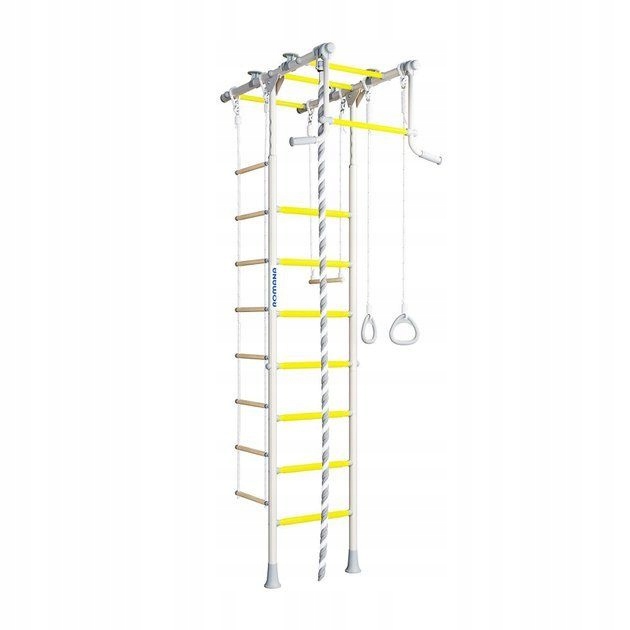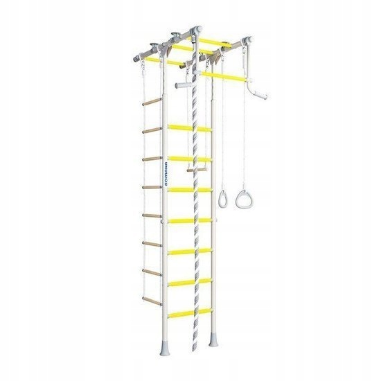 Двостороння гімнастична драбина Комета-1 має вбудовані у верхню раму балки, які виступають з обох сторін драбини. Ця металева конструкція гімнастичного набору дозволяє встановити гімнастичне приладдя, підвішене по обидва боки драбини, і дозволити двом людям займатися одночасно. Завдяки подовженій верхній рамі ми можемо розташувати аксесуари так, щоб вони не заважали під час розгойдування, розгойдування та лазіння. Нерегульована гімнастична планка – це зручно для дорослих і виклик для дітей.
