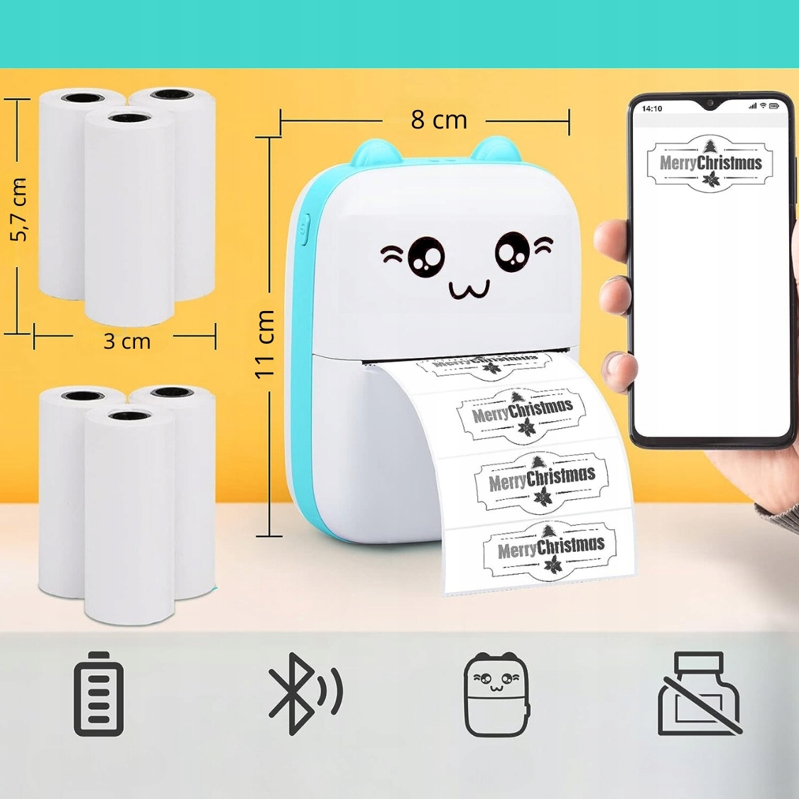 Функції цього пристрою, популярного DRUKUŚ, забезпечують високоякісний друк, зокрема: транспортні етикетки, етикетки для спецій і банок, навчальні посібники, малюнки і все необхідне. Крім того, наша модель термопринтера одна з небагатьох, яка має функцію друкуфото. На одному терморулоні цей міні-принтер може друкувати приблизно до 50 фотографій у дуже швидкому темпі.
