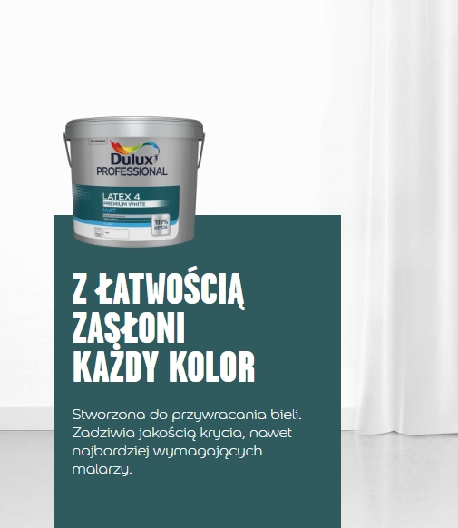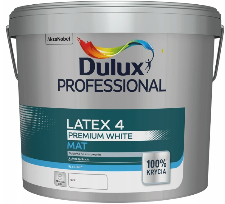 Dulux Professional Latex 4 Premium White — це матова латексна емульсійна фарба, призначена для фарбування стін і стель усередині приміщень.