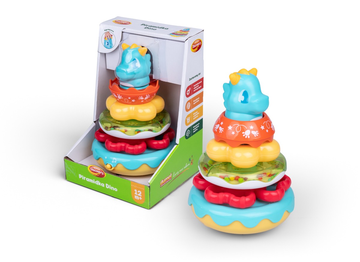 У казково барвистого динозавра цілих 4 кільця, одне з яких брязкає. Малюк може переставляти їх за своїм бажанням, створюючи пірамідку, або грати ними окремо. База Dino хитається з боку в бік, що робить гру ще веселішою! Перемикач активує мелодії.