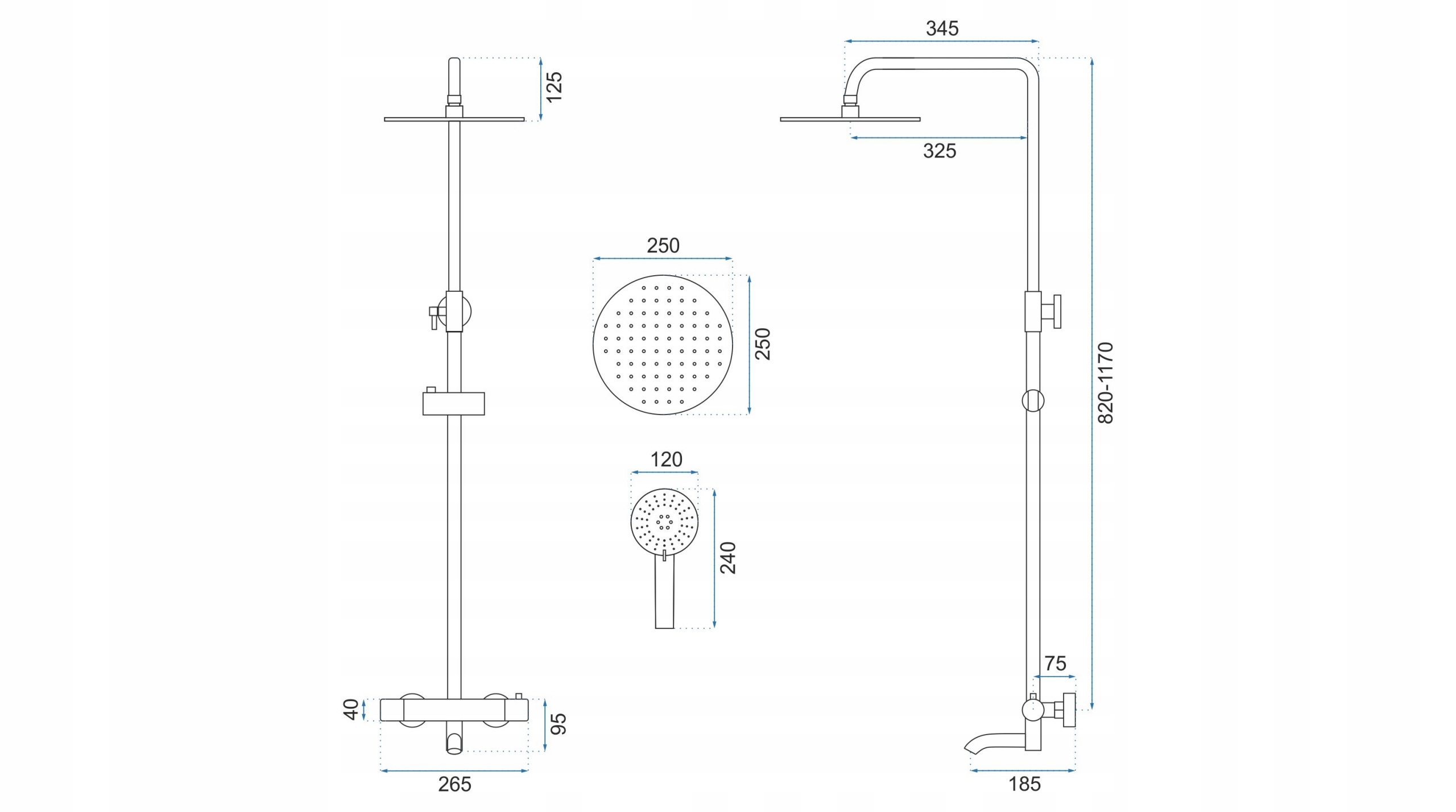 - Склад набору : Термостатичний змішувач із виливом, душовий шланг із трубкою, сталевий тропічний душ