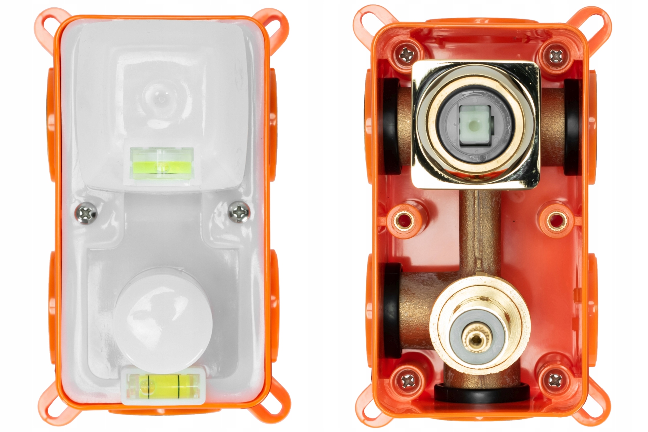 Представляємо інноваційну систему Box для встановлення прихованого змішувача. Система забезпечує зручний і швидкий монтаж. Виготовляється з пластикових і латунних внутрішніх елементів, що гарантує високу якість і надійність. Елемент оснащений маскувальною частиною, яка захищає внутрішні елементи під час складання, і рівнем, який сприяє правильному і точному монтажу. Система забезпечує легкий доступ до внутрішніх компонентів батареї після встановлення з метою обслуговування.