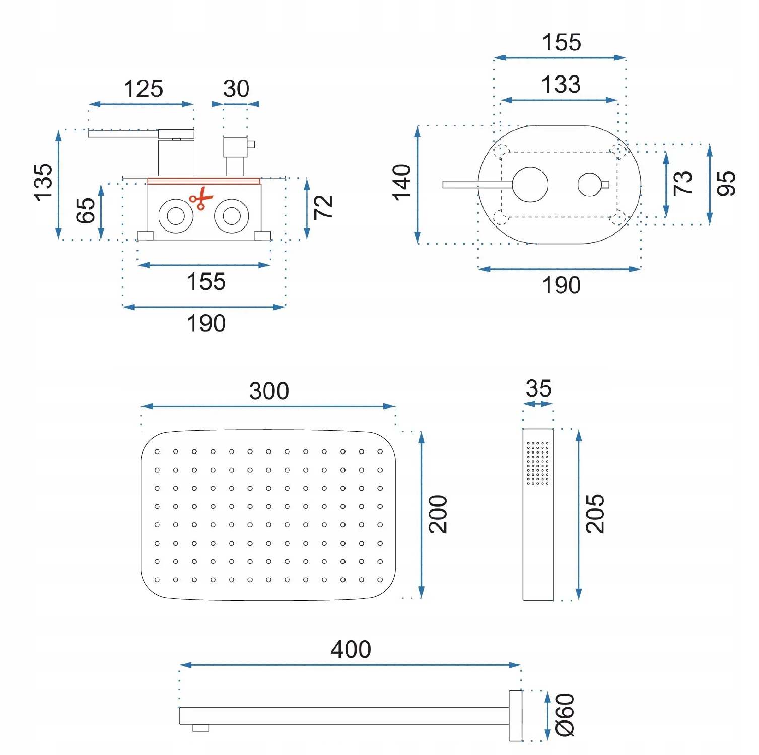 До комплекту входить тонкий прямокутний тропічний душ 20х30 см, змішувач з накладними та прихованими елементами, шланг з металевою лійкою та набір точок.