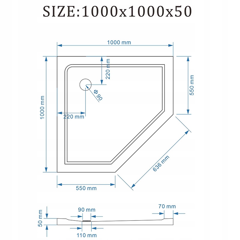 П'ятикутний душовий піддон 100x100 ST08C чорний сифон 5 см низька діамантова плитка