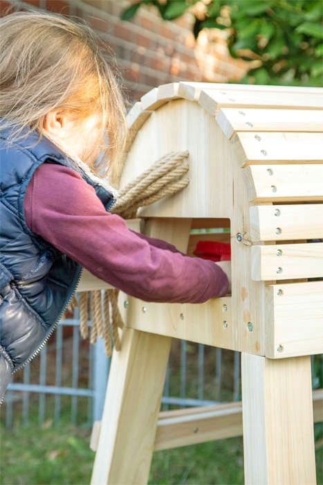 Конструкція, завдяки широко розставленим ніжкам, стійка і міцна, стійка до погодних умов. Інтер'єр коня ідеально підходить для зберігання спорядження або аксесуарів для прибирання, закривається клапаном. Грива і хвіст скакуна зроблені з сизалю, їх можна укласти будь-яким способом. Розмір спинки підходить для подушок сидіння і справжнього сідла. Головний комір включено!