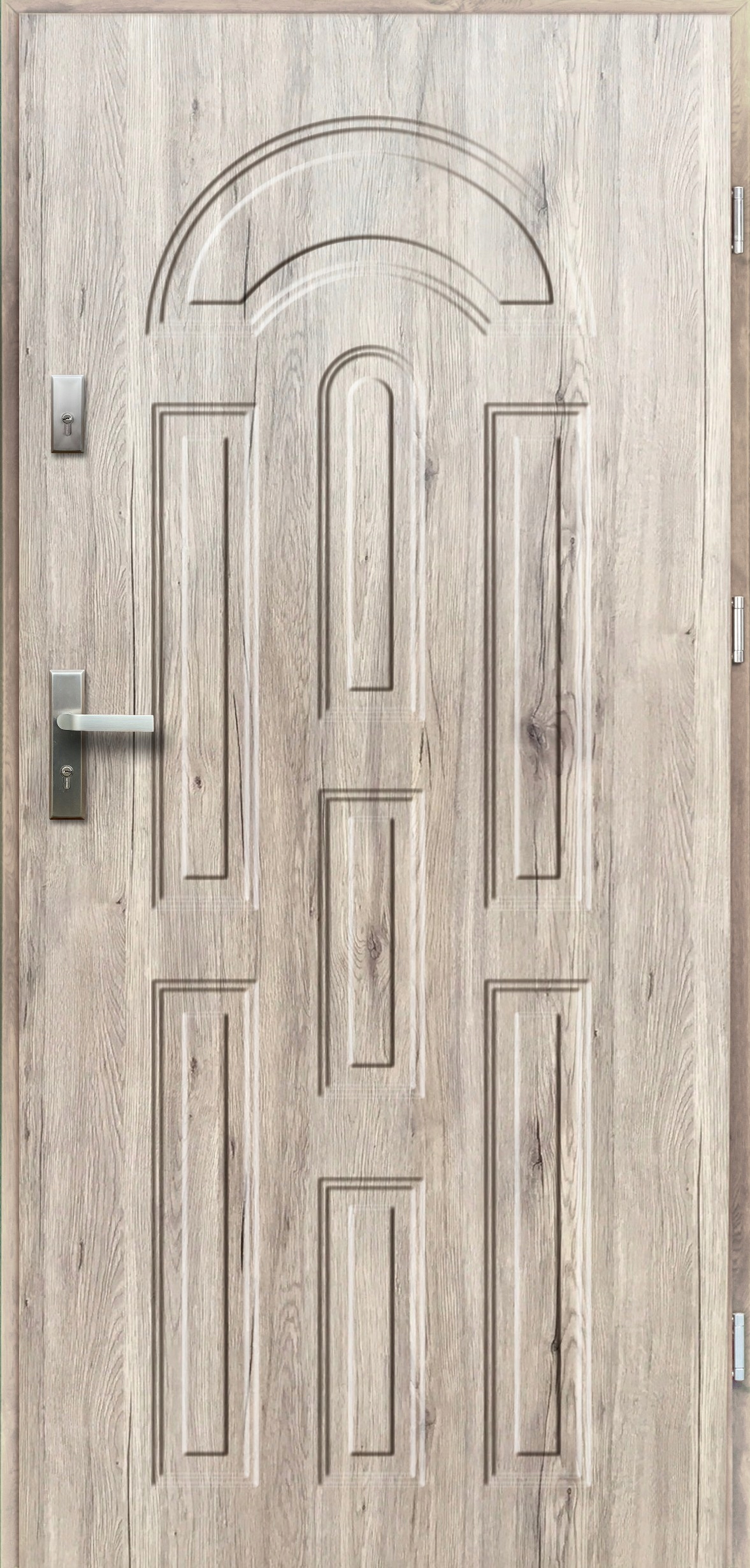Двері товщиною 55 мм, виготовлені зі сталі, покритої декоративною плівкою зі структурою і кольором дерева, стійкі до УФ-випромінювання.