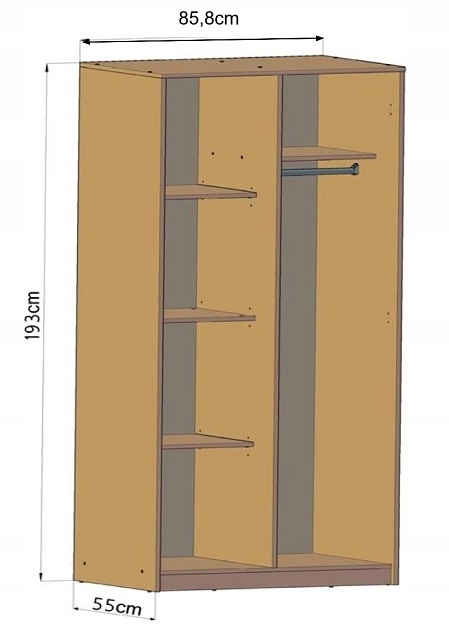Шафа 2D4P розділена на дві частини. Частина зліва має 3 регульовані полиці. Частина справа має полицю та поручень для підвішування одягу.