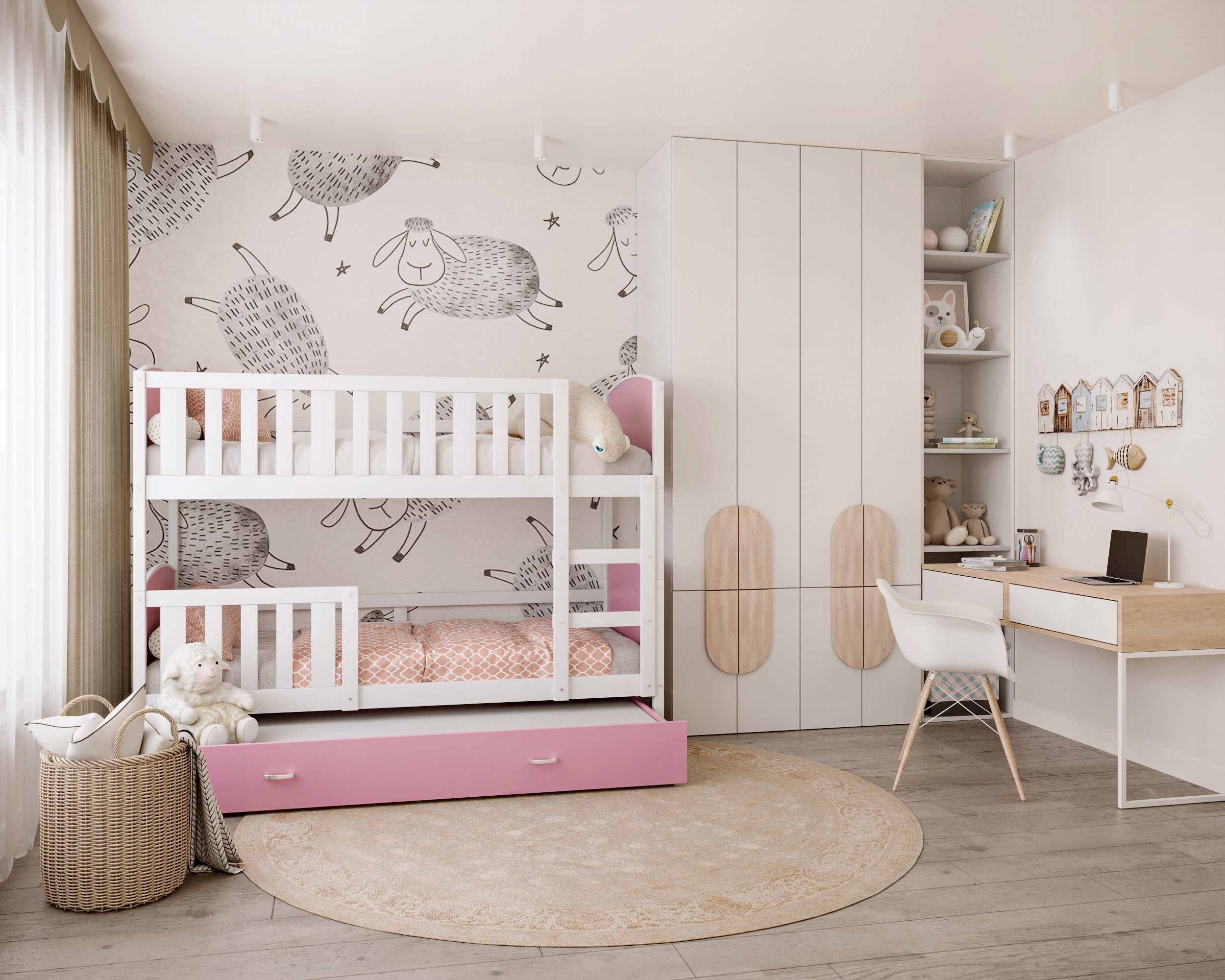 біле ліжко з рожевим ящиком