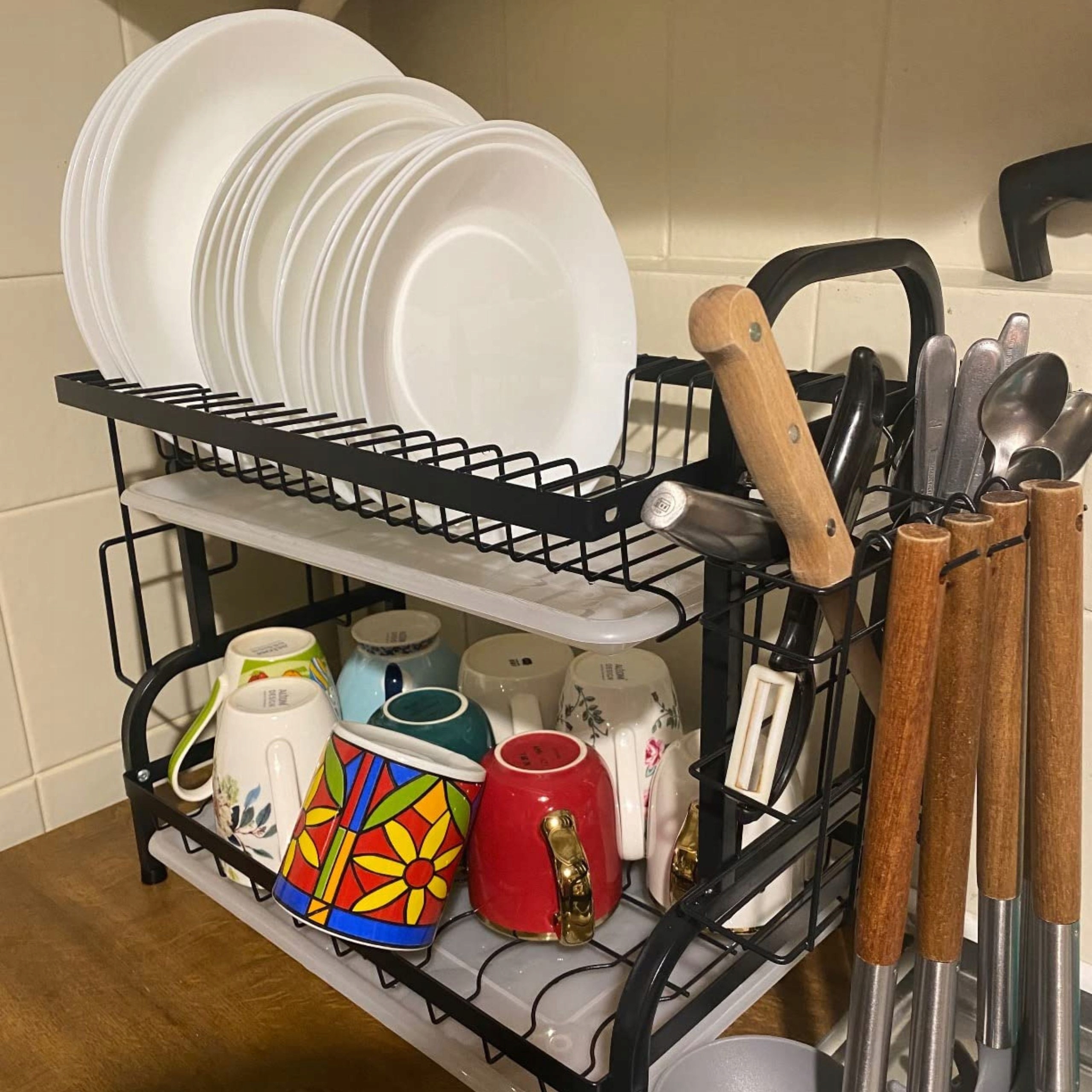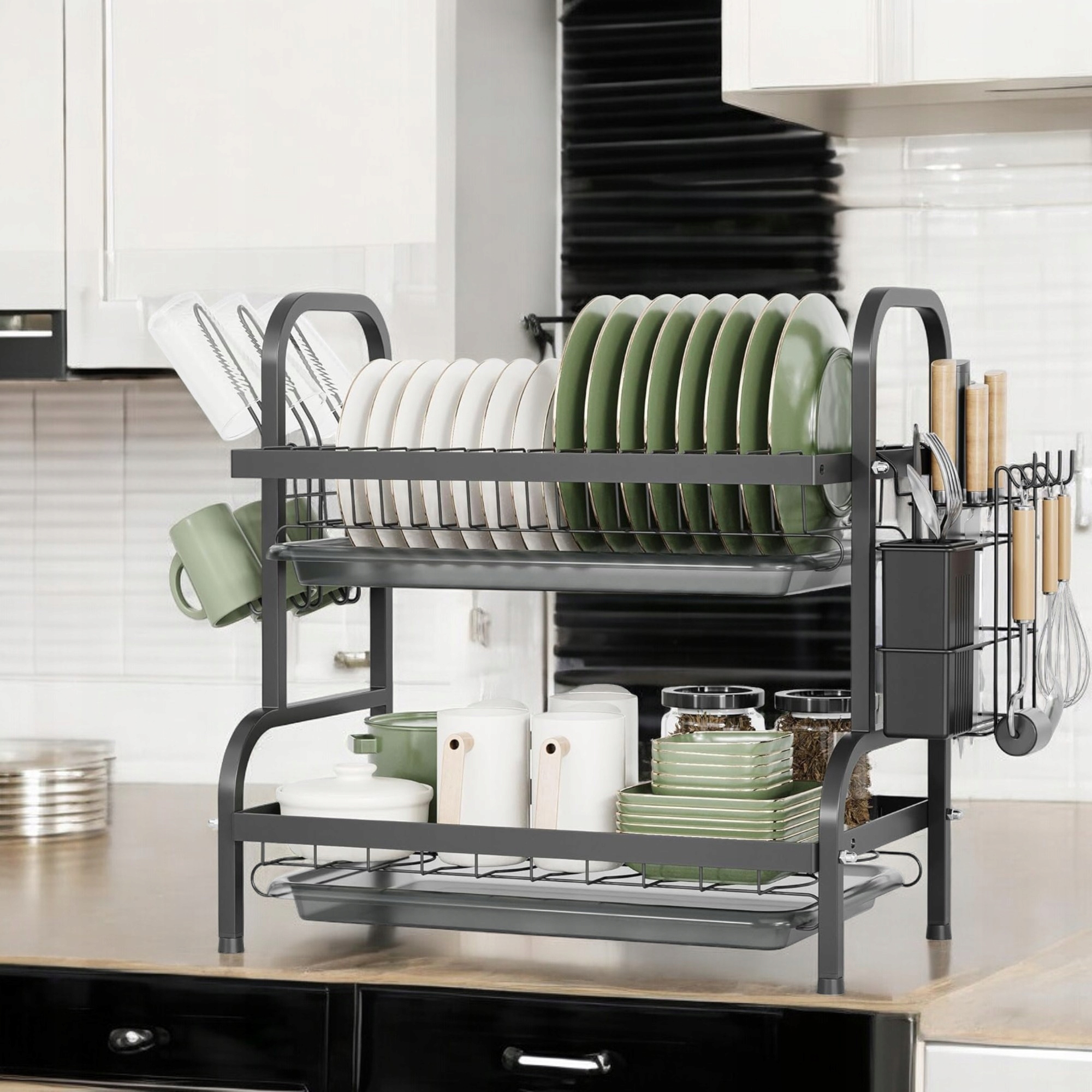 ✅ Відкрийте для себе дворівневу сушарку для посуду зі зливом, яка допоможе вам підтримувати порядок і чистоту на вашій кухні. Виготовлений з чорного нержавіючого металу, він гарантує довговічність і легкість у дотриманні порядку. Завдяки функціональному дизайну вміщує багато посуду, економлячи місце на стільниці.