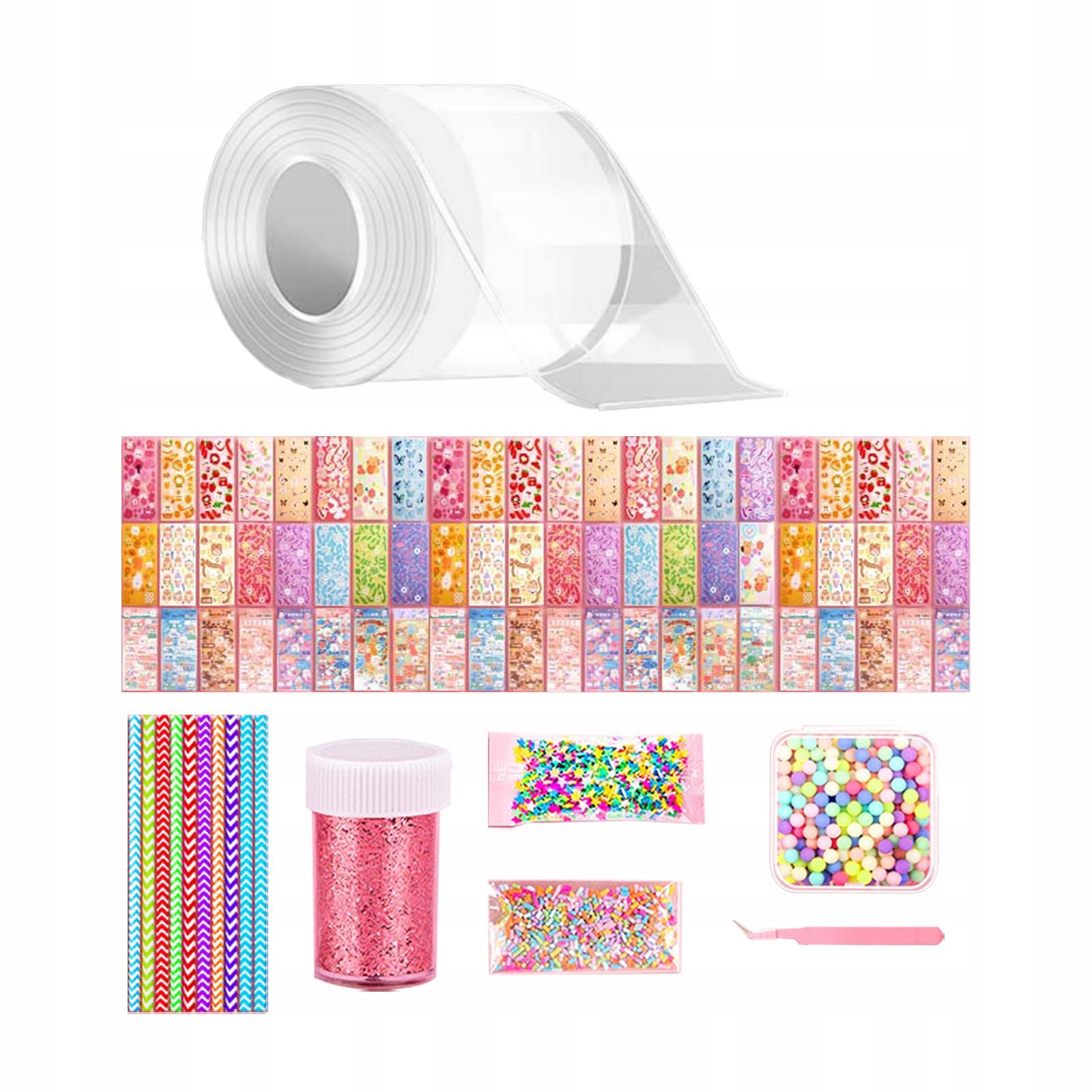2 рулони стрічки, 10 наклейок, 10 подушок, 1 пачка блискіток, 1 пачка п’ятикутна зірка, 1 упаковка цукрових гранул, 1 упаковка бісеру, 1 пінцет