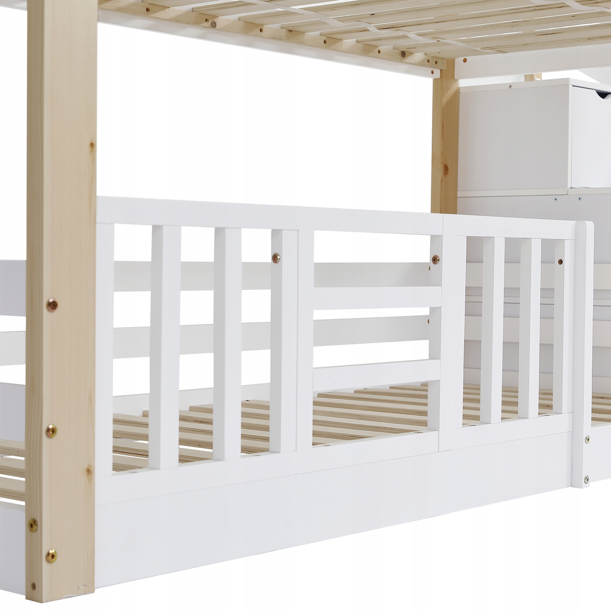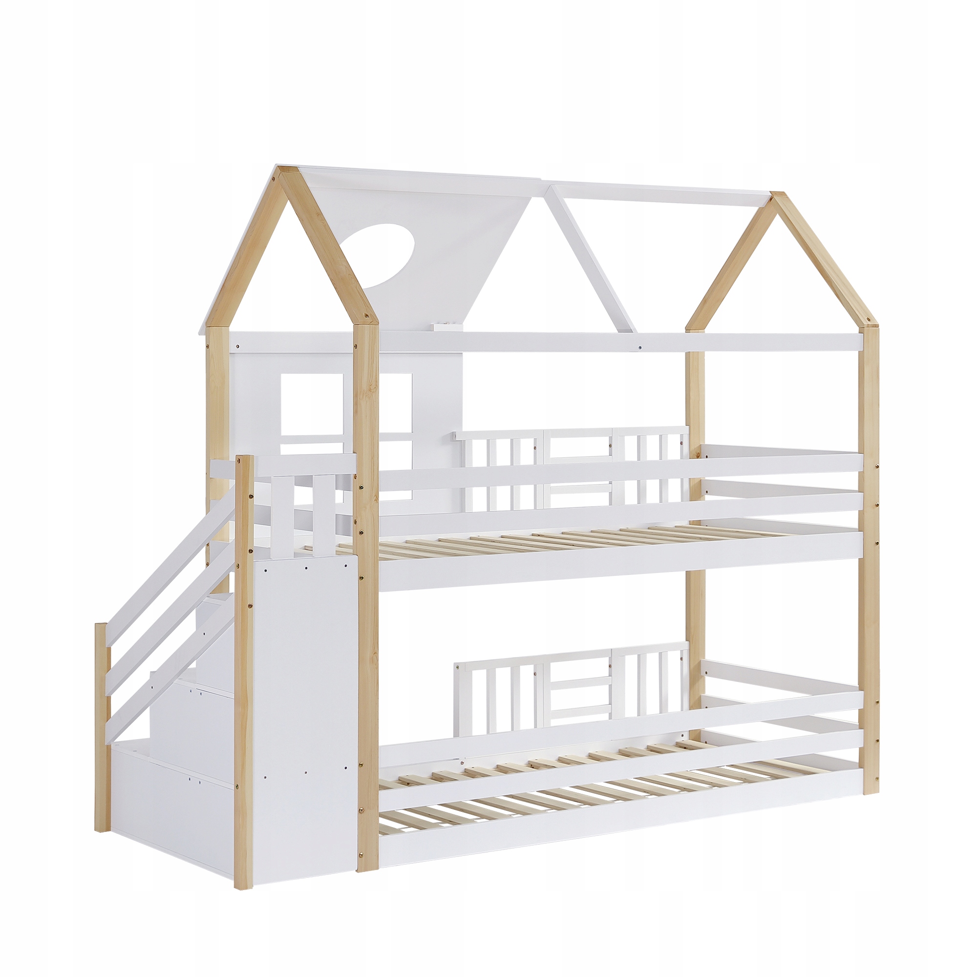 двоярусне ліжко зі сходами для сходів, домашнім ліжком, дитячим ліжком, з стійкою, що захищає від падіння, з вікном та дахом, сосна+mdf, білий+натуральний, 90x200 см