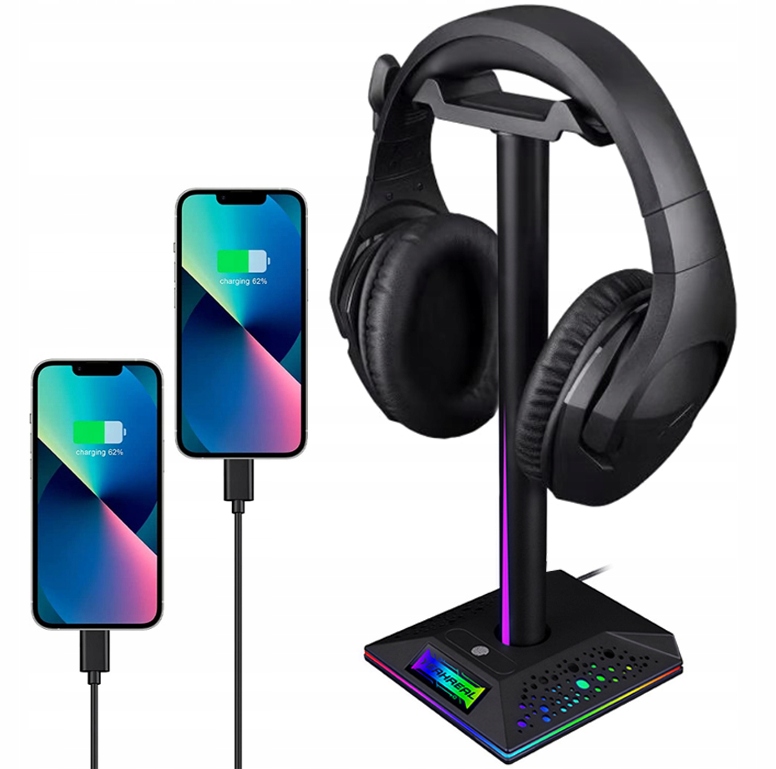 Покажіть свої навушники стильно за допомогою нашої сучасної підставки для навушників. Оснащений підсвічуванням RGB, функцією USB HUB і аудіовходом 3,5 мм, він ідеально підходить для геймерів, любителів музики та всіх, хто цінує порядок на своєму столі.