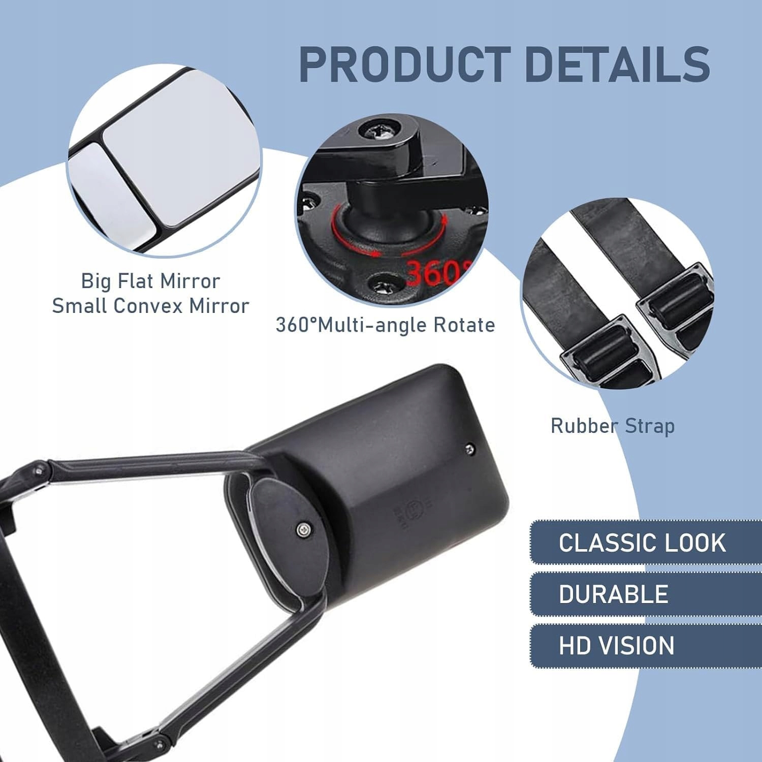 Ці дзеркала можна легко встановлювати та знімати, що робить їх надзвичайно практичними у використанні. Ідеально підходить для використання під час подорожей з караванами, кінними стійлами та іншими великими транспортними засобами. У комплект входять два дзеркала, які забезпечують розширений огляд, підвищуючи комфорт і безпеку водіння.