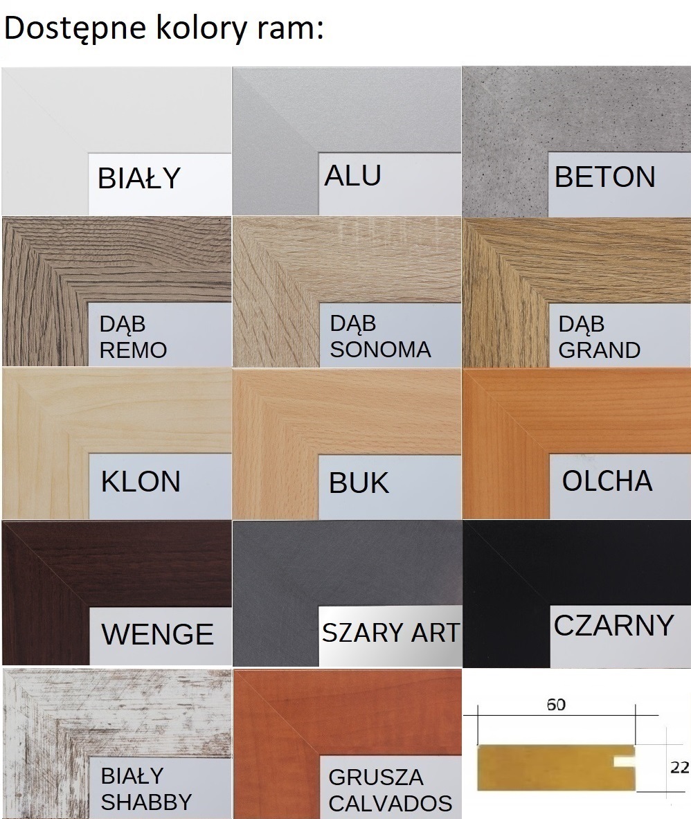 На фотографіях нижче показано приклад розміру 70x50 см (включно з рамою) у доступних кольорах рами.