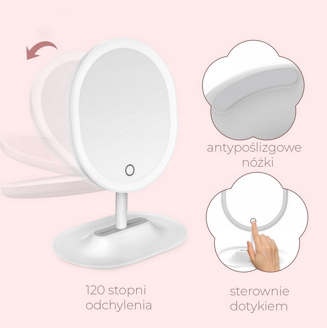 Регульований кронштейн дозволяє встановити дзеркало під потрібним кутом. На увігнутій підставці можна розмістити косметику, пензлі та інші дрібні аксесуари. Протиковзкі гумки забезпечують належну стійкість. Дзеркало важить всього 580 г, його можна легко розібрати на дві частини і покласти в сумочку.
