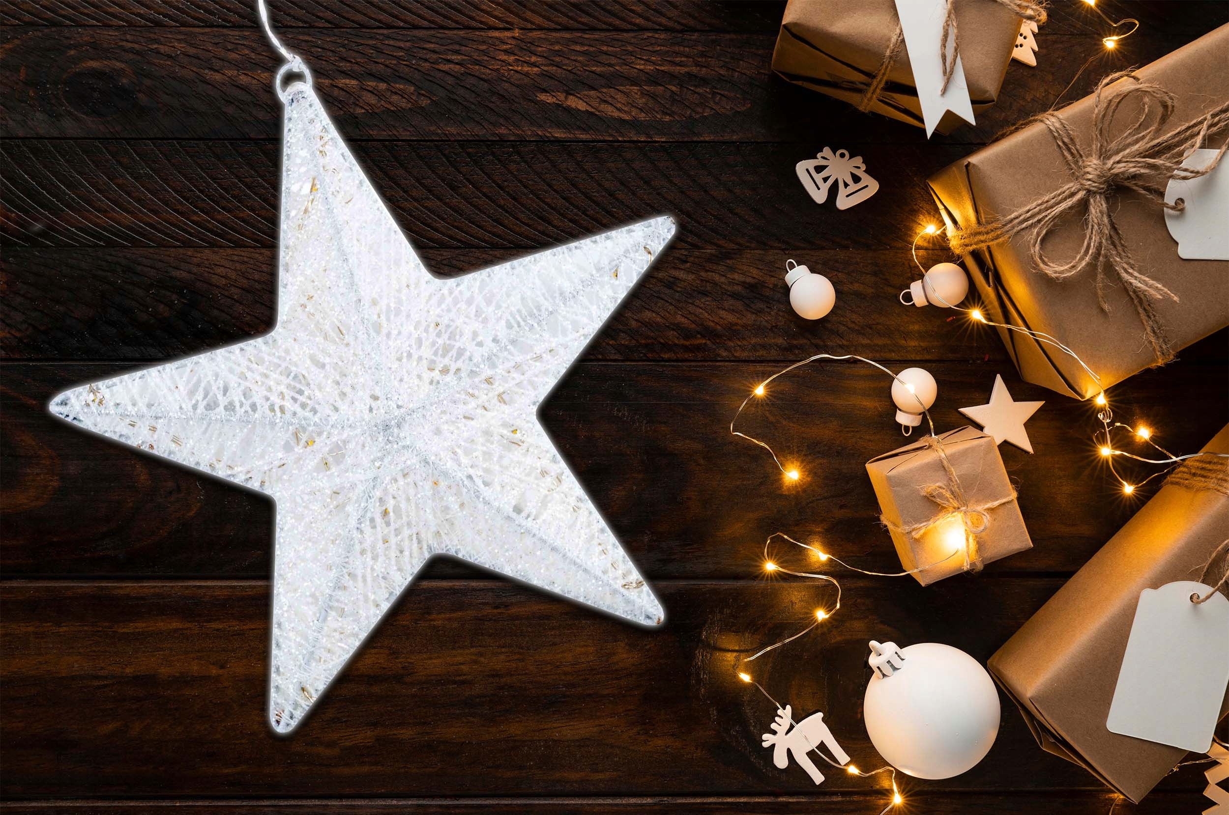 Різдвяна/різдвяна прикраса у формі зірки, наповнена LED діодами. Зірка покрита матеріалом, що імітує сніг та лід.