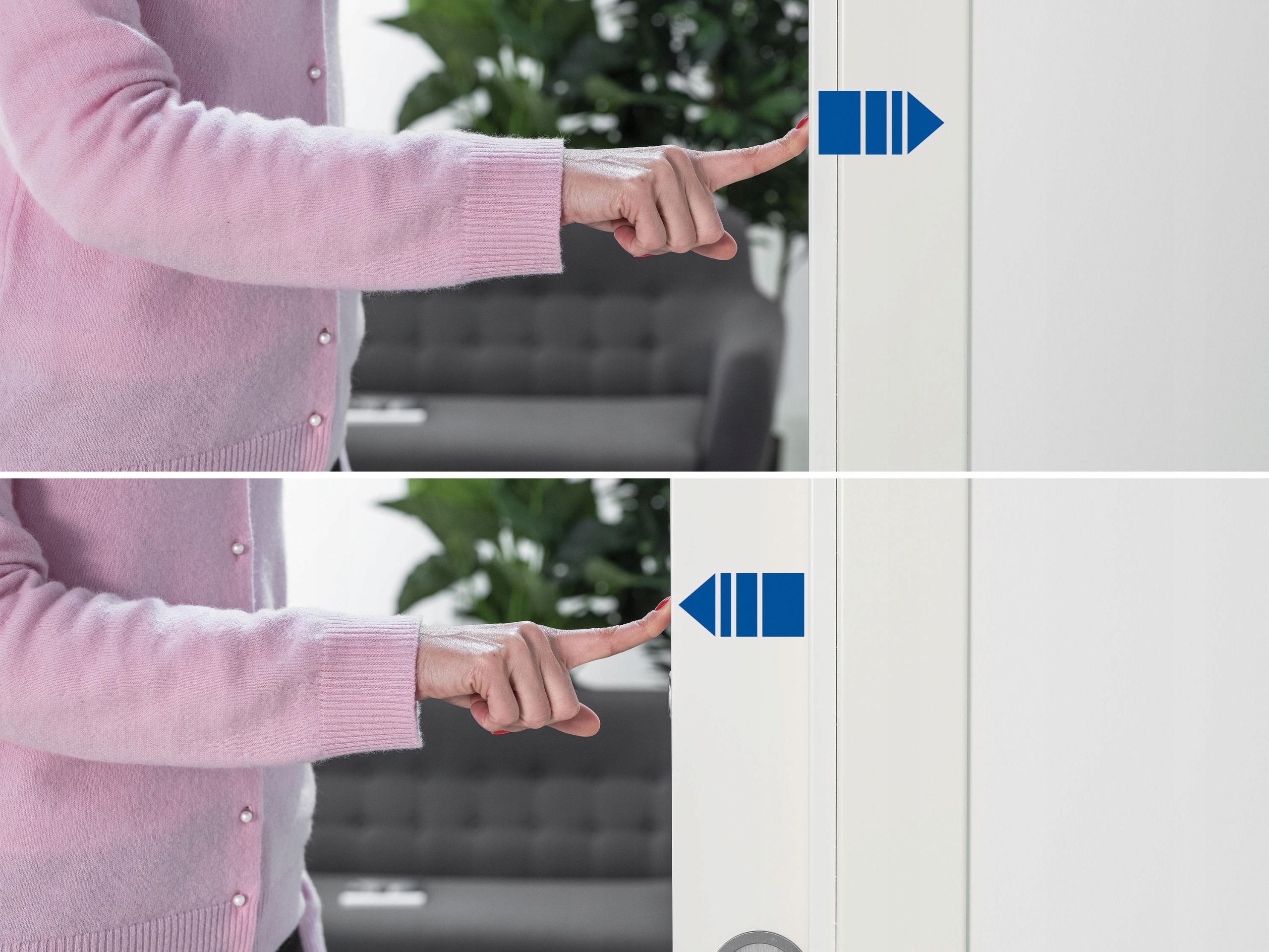 Дбаючи про руки своїх клієнтів, компанія Eclisse розробила систему висування крила з кишені касети за допомогою невеликого тиску (сила активації 30 Н, рівна тиск одного пальця) на вузьку площину крила. Легкий натиск звільняє пружину механізму, який висуває стулку з кишені, щоб ви могли використовувати традиційні ручки для подальшого закриття дверей. Пружина механізму знову натягується шляхом натискання на стулку до повного відкритого положення.