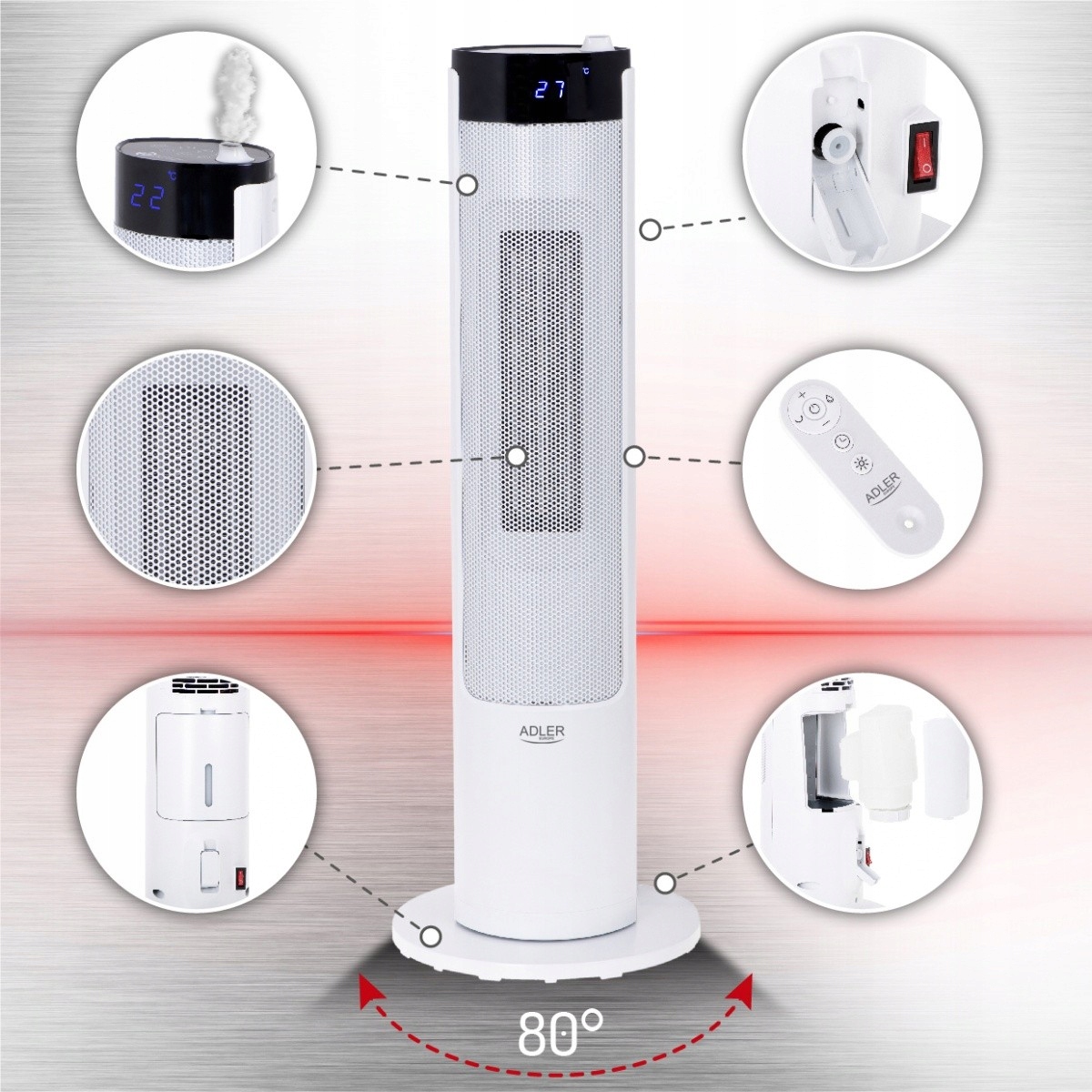 Любителям багатофункціональних рішень варто звернути увагу на обігрівач-колонку з зволожувачем ADLER AD 7730 LCD. Це сучасний прилад, який містить радіатор, зволожувач повітря та вентилятор в одному елегантному тонкому корпусі добре виглядатиме як у спальні, так і у вітальні, покращуючи комфорт перебування в кожній з них ці кімнати. Економія місця є лише однією з його переваг.