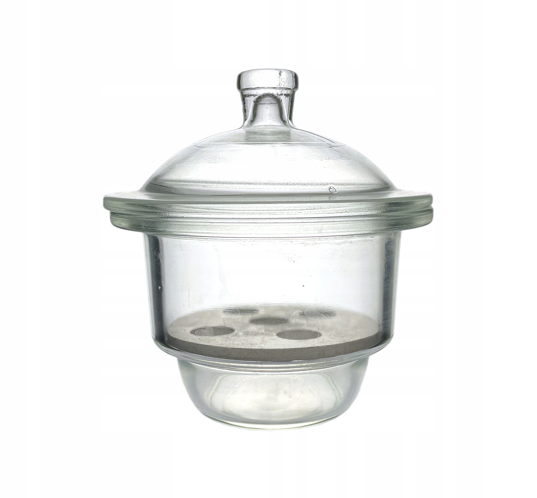 Ексикатор містить плоску скляну кришку та порцелянову вставку з отворами.