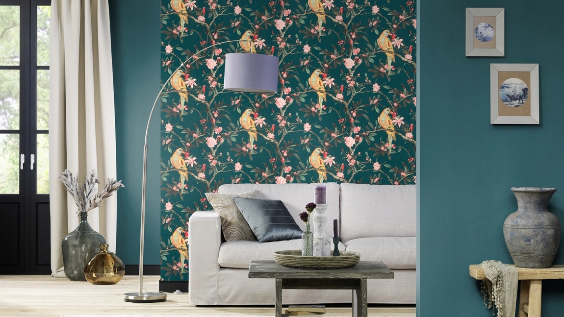 - Високоякісні шпалери з мотивом папуги серед квітів