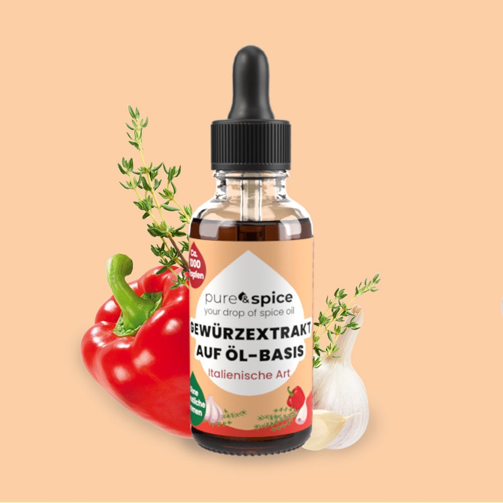 З нашим екстрактом спецій «італійський стиль» від pure & spice ви принесете живий середземноморський аромат Італії у свій дім. Ви можете легко визначити інтенсивність кожної страви самостійно - дозуючи її по краплях!