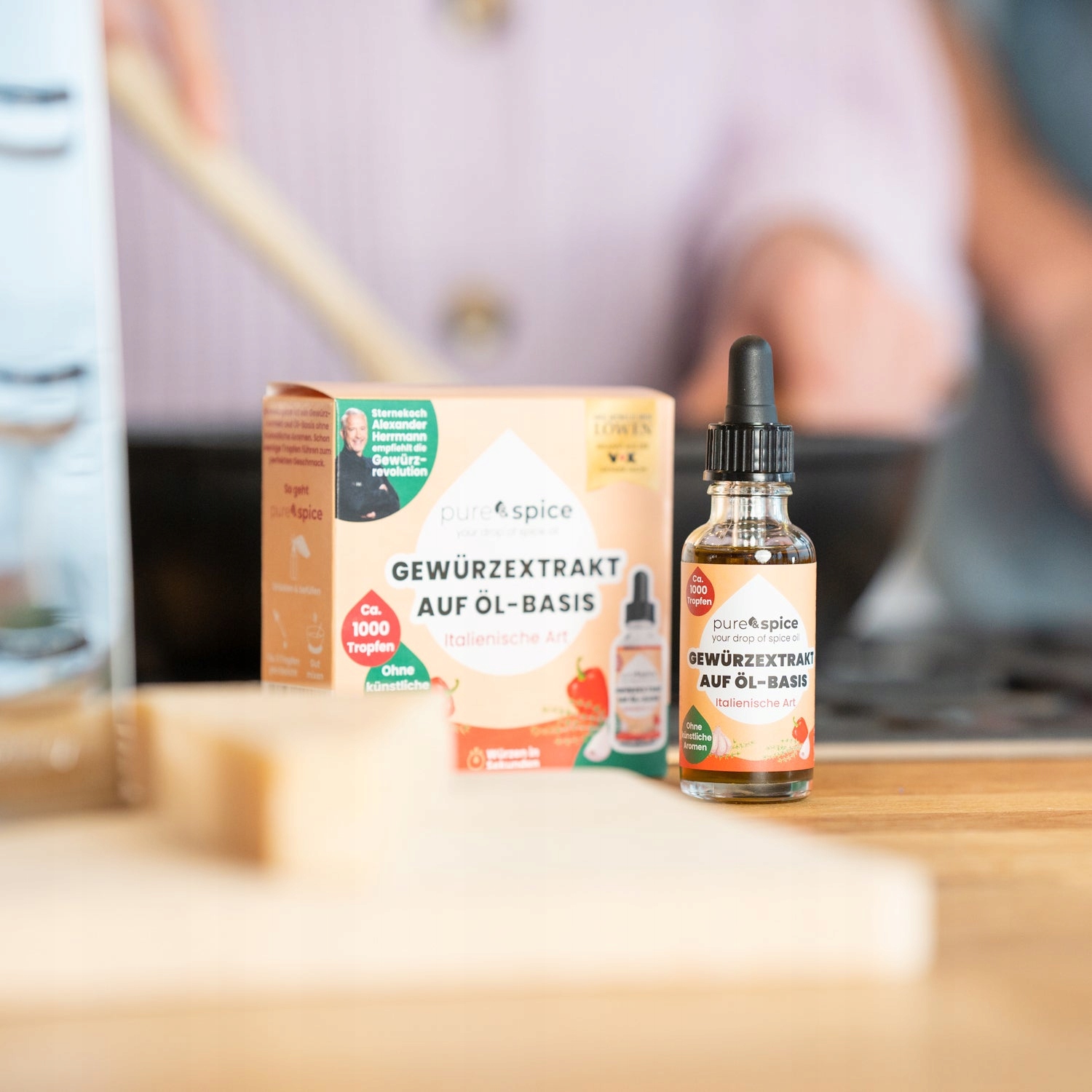Змініть свою домашню кухню за допомогою екстракту спецій від pure&spice! Дивовижна рідка форма смаку, яку ви можете дозувати так м’яко чи так інтенсивно, як забажаєте – крапля за краплею!