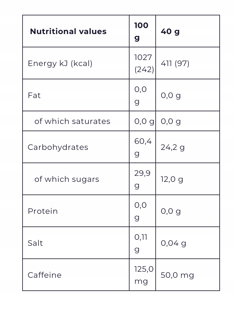 Спосіб застосування: 1-4 гелі на день. Не перевищуйте рекомендовану дозу. Високий вміст кофеїну (125 мг/100 мл). Не рекомендується використовувати дітям, вагітним і годуючим жінкам, а також людям, чутливим до кофеїну. Продукт не можна використовувати як заміну різноманітного харчування та здорового способу життя. Зберігати в сухому прохолодному місці, подалі від сонячних променів. Веган.