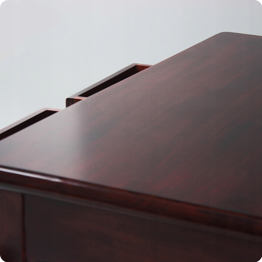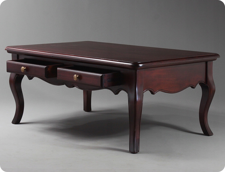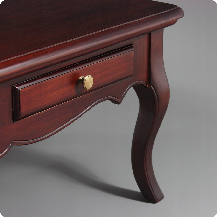 Низький журнальний столик для стильної вітальні. Стільниця меблів прямокутна, під стільницею два ящика. Все це зроблено з високоякісного масиву дерева.