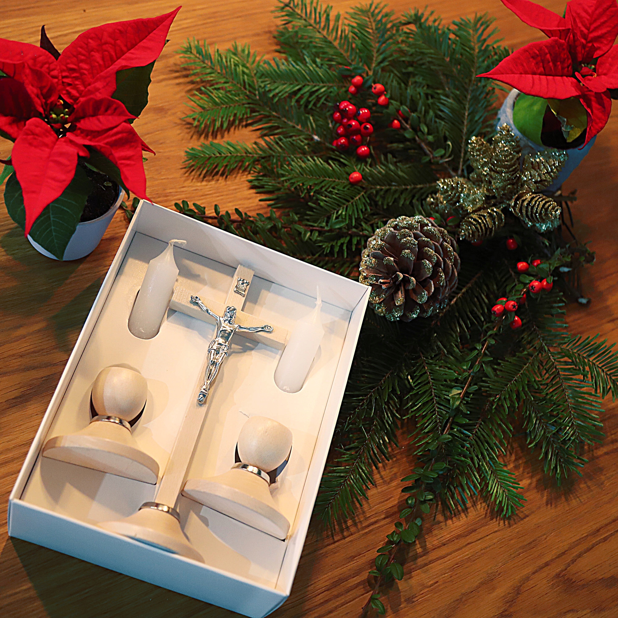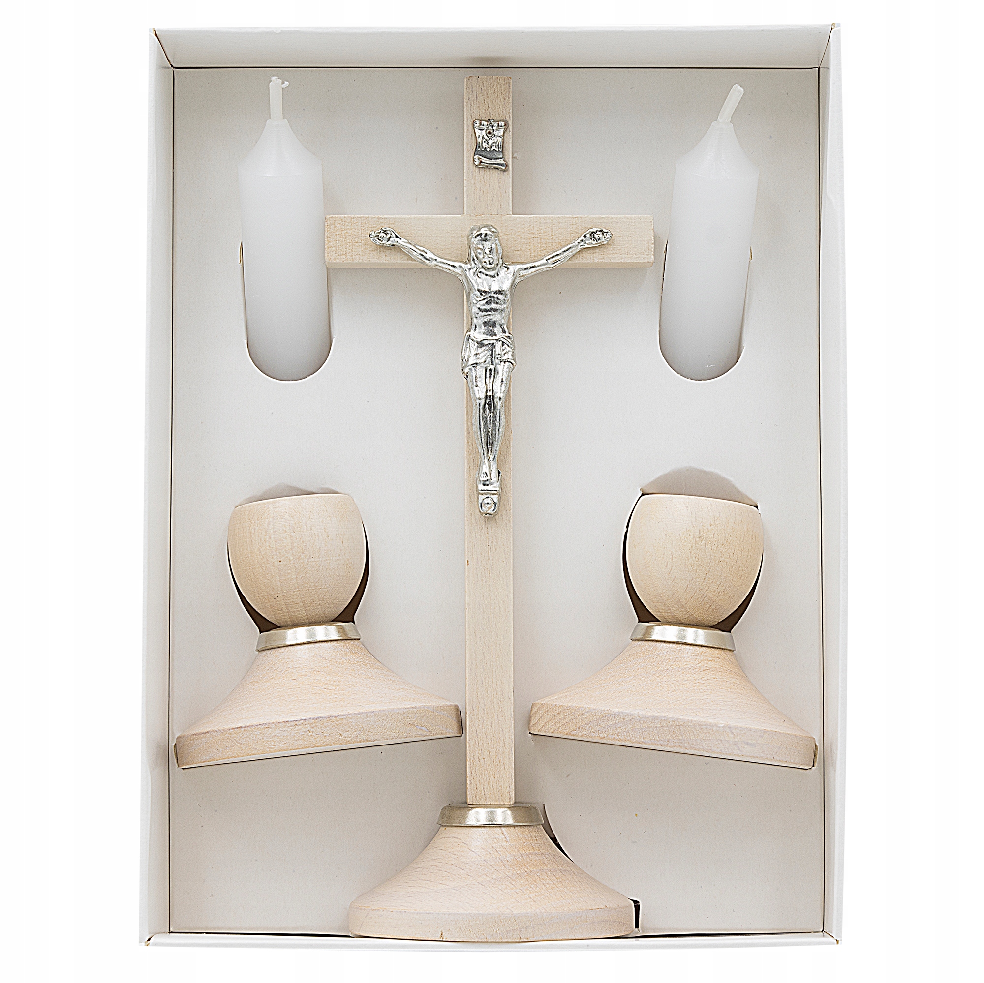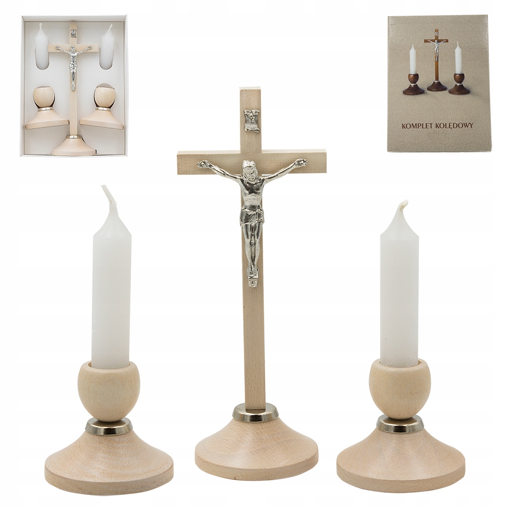 Ми пропонуємо елегантний і практичний набір Керол, який ідеально підходить не лише для пасторального візиту, але і як постійний елемент домашнього вівтаря чи прикраси в релігійному дусі. Набір включає хрест із фігурою Ісуса Христа висотою 19 см і дві свічки на дерев’яних стендах висотою 15 см (разом зі свічкою). Це прекрасний і функціональний набір, який підкреслить духовний вимір як щоденних молитов, так і святкових моментів. Свічка)