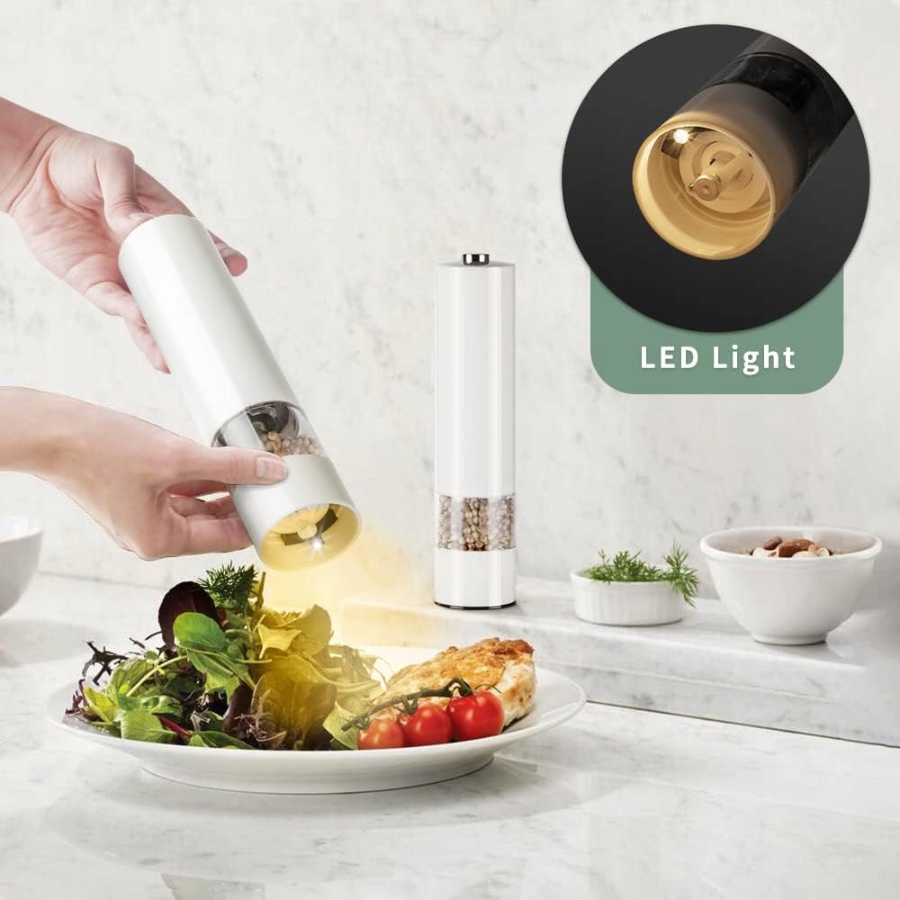 Електрична подрібнювальна машина для солі та перцю, 2 штуки, подрібнювач для перцю, перцю та солі з регульованим керамічним механізмом подрібнення зі світлодіодним підсвічуванням (білий)