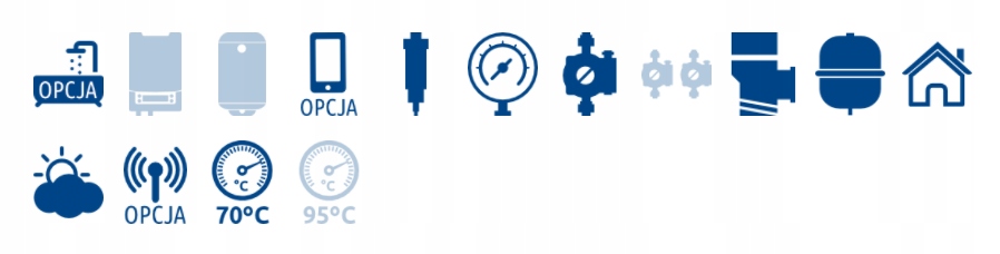 - Гладке регулювання центральної температури нагрівання води 5 ÷ 70 ° C, для нагрівання підлоги 5-40 ° C