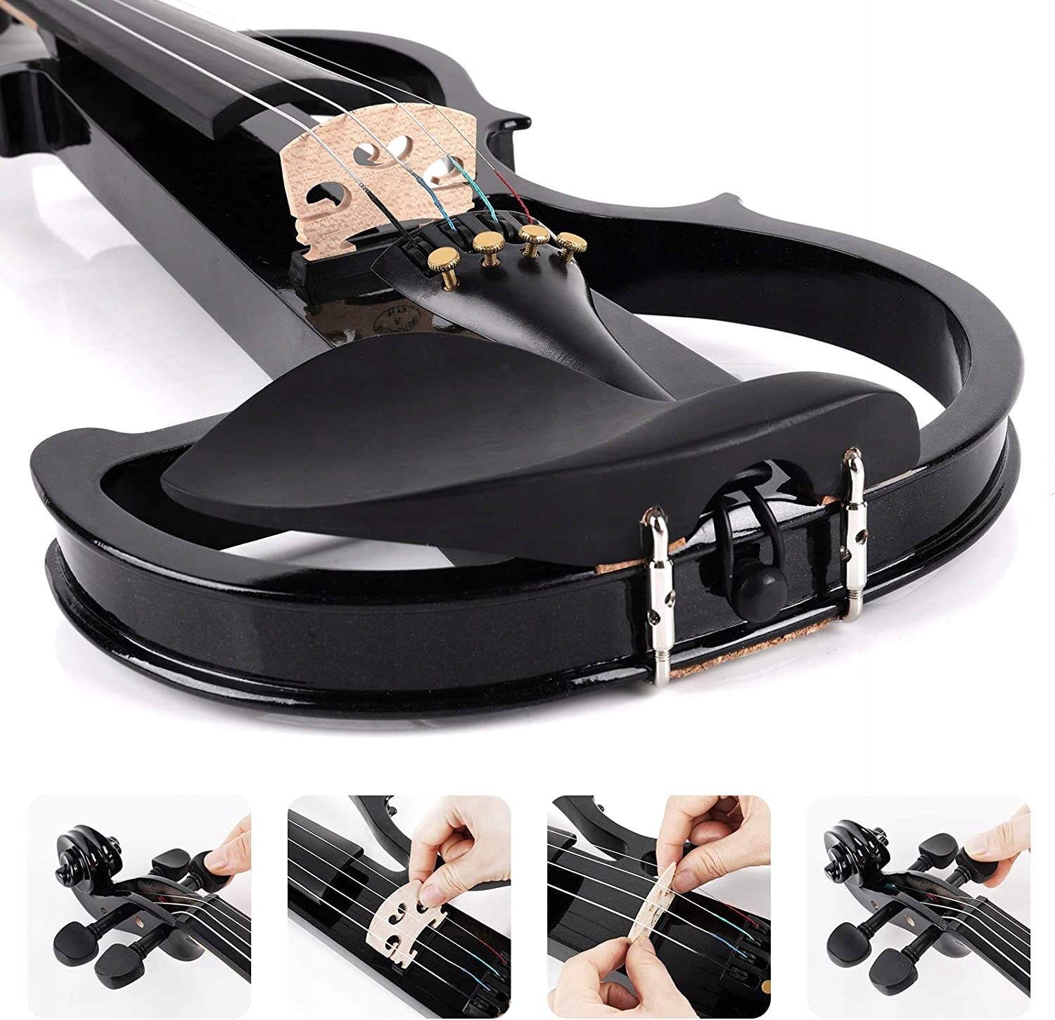 високоякісне кленове дерево -тіло у чорному металевому лаку, який видає чітку, резонансну та яскравішу звук. Масивна голова клена, лобове скло та Підтримка підборіддя міцні для тривалої практики