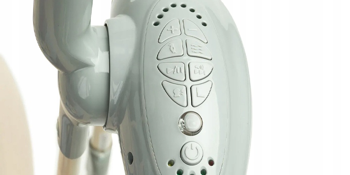 Панель керування Caretero Loop має багато функцій, які дозволяють налаштувати пристрій відповідно до наших потреб. Ми можемо використовувати, серед іншого, опцію зміни швидкості гойдання (8 швидкостей на вибір), відтворення завантажених мелодій і відтворення власних музичних файлів. Характерною особливістю Caretero Loop є функція виявлення голосу.