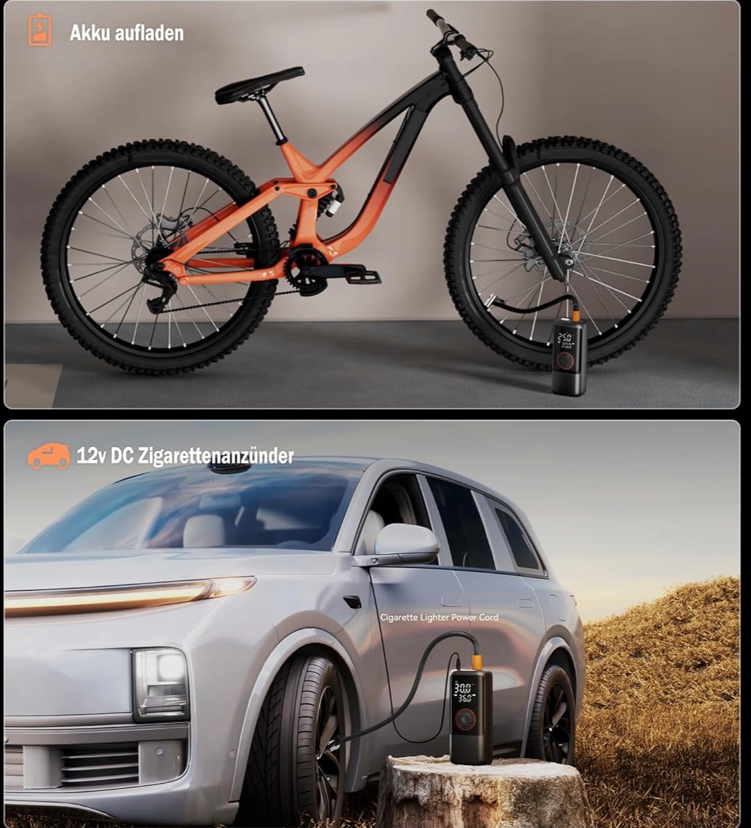 4 + N режимів накачування: для велосипедів, мотоциклів, автомобілів і м’ячів пропонуються 4 попередньо визначені режими накачування, які є зручними та швидкими. Індивідуальний режим портативного автомобільного насоса дозволяє регулювати тиск від 3 до 150 PSI, залежно від предмета, який накачується. Для задоволення різних потреб. Що краще: коли досягається заданий тиск, електричний насос автоматично вимикається, забезпечуючи вашу безпеку кожного разу, коли ви його використовуєте.