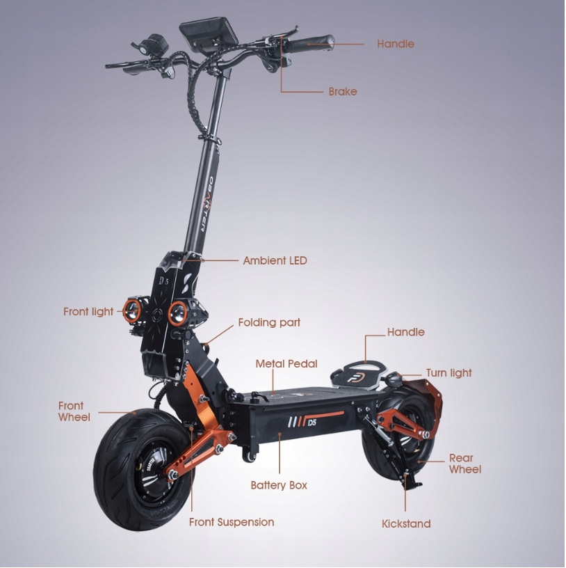 оснащений подвійним двигуном 2*2500 Вт (максимальна потужність 5000 Вт), забезпечуючи високий крутний момент та низьке споживання енергії. OBARTER D5 може досягти максимальної швидкості 60-70 км/год і нести до 150 кг. Термін дії двигуна збільшився до 3000 годин (висока потужність, низька теплота, більша ємність розсіювання тепла)