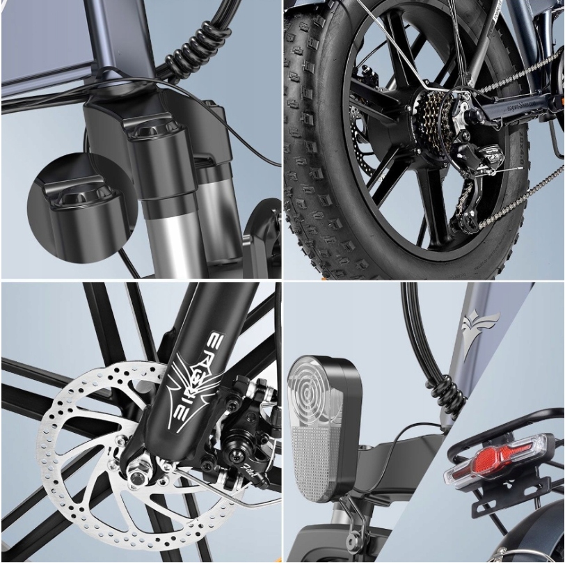 Електричний велосипед має відмінну раму з алюмінієвого сплаву, високу міцність та високу корозійну стійкість. Передня вилка виготовлена з вуглецевої сталі з високою обтяжкою і забезпечує амортизацію, що забезпечує найвищий комфорт. Завдяки легкому та ефективному дизайну, 20-дюймове колесо з алюмінієвого сплаву підходить як для їзди в місті, так і для стежок.