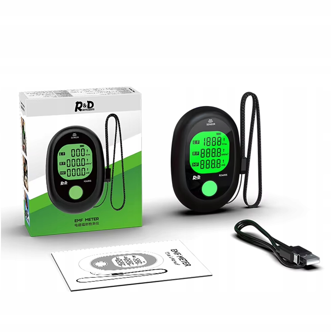 - Універсальність: Один пристрій для одночасного вимірювання електричного (EF), магнітного (MF) та радіо (RF). Дисплей: Графічний РК -екран з оцінкою рівня радіації та тенденціями значення.
