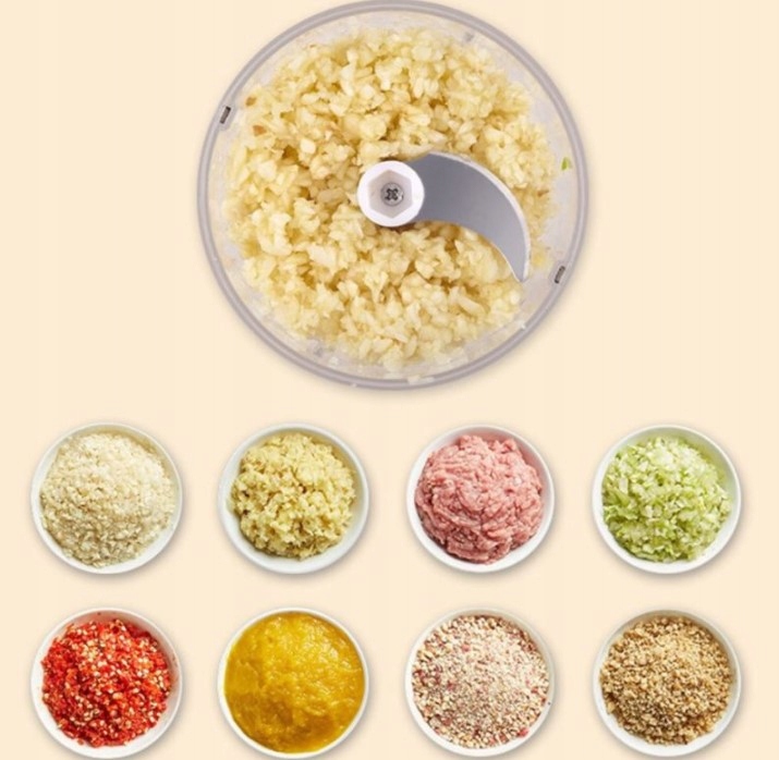 Високоякісні матеріали: лезо з нержавіючої сталі міцне, міцне та довговічне, а також дозволяє ефективно різати. Харчовий пластик у чашці не містить бісфенолу А, безпечний для їжі, міцний і не містить бактерій. Гостре лезо часникорубки може швидко подрібнити часник, зелень, овочі, лід тощо.