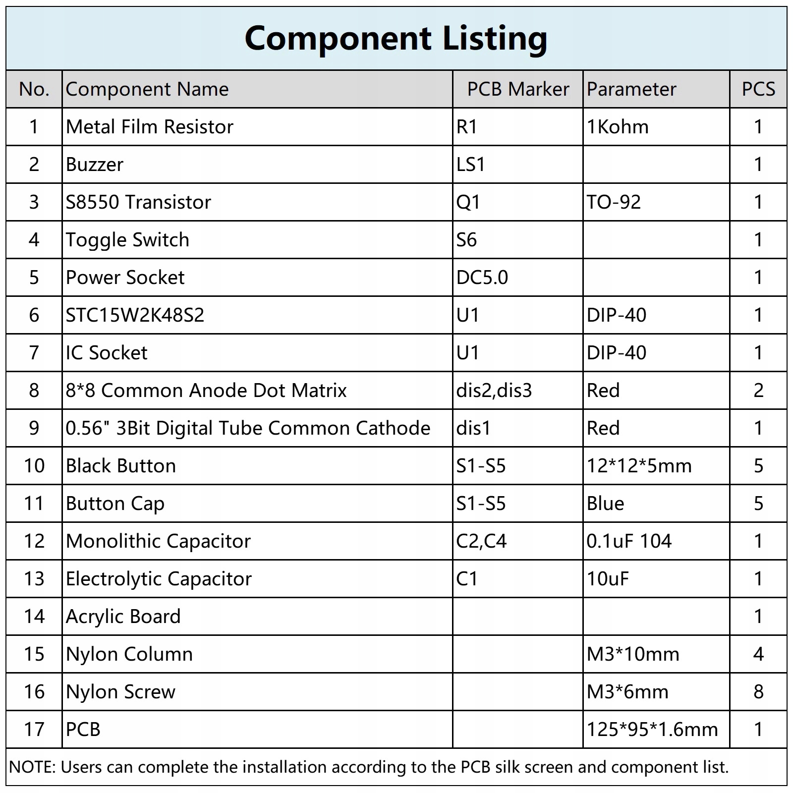 The системи мають друковану схему монтажу на платі. Необхідно звернути увагу на полярність у випадку таких елементів, як конденсатори, діоди, транзистори. У світлодіодів довша ніжка плюс +, параметри більшості елементів описані на корпусі. Резистори можуть мати маркування смугами; їх опір і допуск можна прочитати за допомогою калькуляторів, доступних в Інтернеті, або виміряти за допомогою лічильника. Порядок складання зазвичай довільний, залежно від компонування спочатку збираємо найменший елемент.